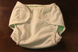 Our diaper service offers compostable disposable diapers, which we use at night. But they also have these interesting compostable liners, which are like a regular diaper with the wings cut off. The attach to the inside of a waterproof cover with sticky tabs. Since I didn’t want the laminated side of the PUL against the baby’s skin, I made a special cover lined in flannel. Clearly, these won’t work for regular cloth diapering, but it’s great for the GroVia soakers.