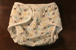 It’s been diaper cover-making central around here, spurred on by the fact that Oliver moved up to the next size cloth diaper and his old covers don’t fit anymore. I’ve found a great source for patterns (www.newconceptions.com, Diaper Covers Deluxe), but am still having trouble getting everything I need (no-pill 3/4″ fold over elastic, 1″ Aplix, and printed PUL) all at the same store. This adorable giraffe printed PUL came from Kids in the Garden.