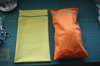 Pin and sew! Now, the two ends of the fabric should be connected by the zipper. Close the zipper and open it up the fabric tube to the right side and using both your hands as you sew (I know, tricky!) pull the fabric taut on either side of the zipper. Top seaming holds the fabric away from the zipper teeth. (Still have the zipper foot for this step.) Gah, you can totally see my wonky seam there! Darn contrasting thread!