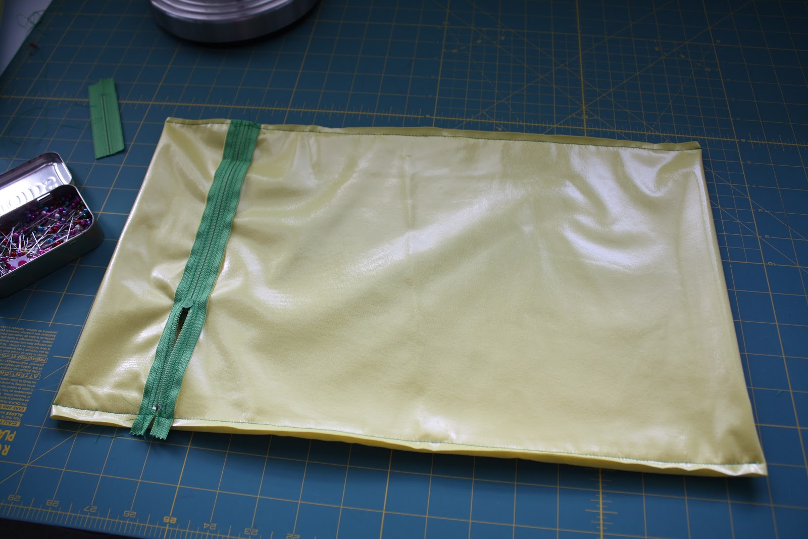 I like to offset my zipper by about 2 inches, but you can do however much or little as you like. Either way, lay your work on a flat surface, and with right sides together, carefully line up the long sides so that the zipper is straight and parallel/perpendicular to the sides and the fabric is as flat as possible. Pin in place. (Notice, I trimmed the zipper at this step.)