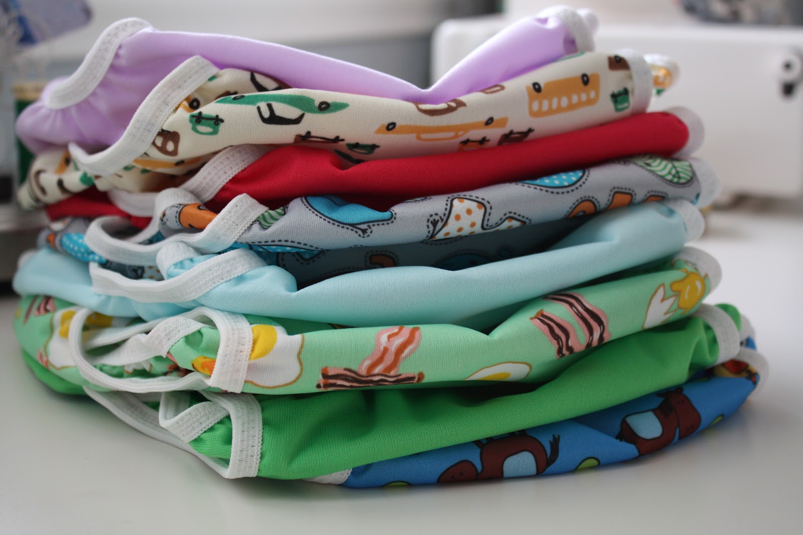 Aren’t they pretty? I just finished up a big (by my small potatoes scale) order of diaper covers. Until this batch, I always made them individually, but I found ways to minimize the number of times I switched stitches and feet to streamline the process. Now I might have to always make multiples!