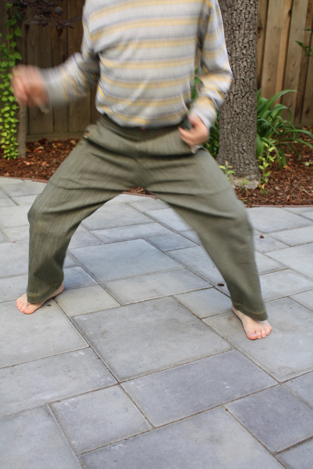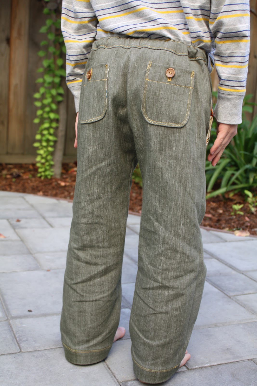 I used a well-fitting pair of pants for the waist and crotch, but drafted the rest of the pattern myself. Slant pockets, back patch pockets and an adjustable elastic waistband were some of the fun parts I added.