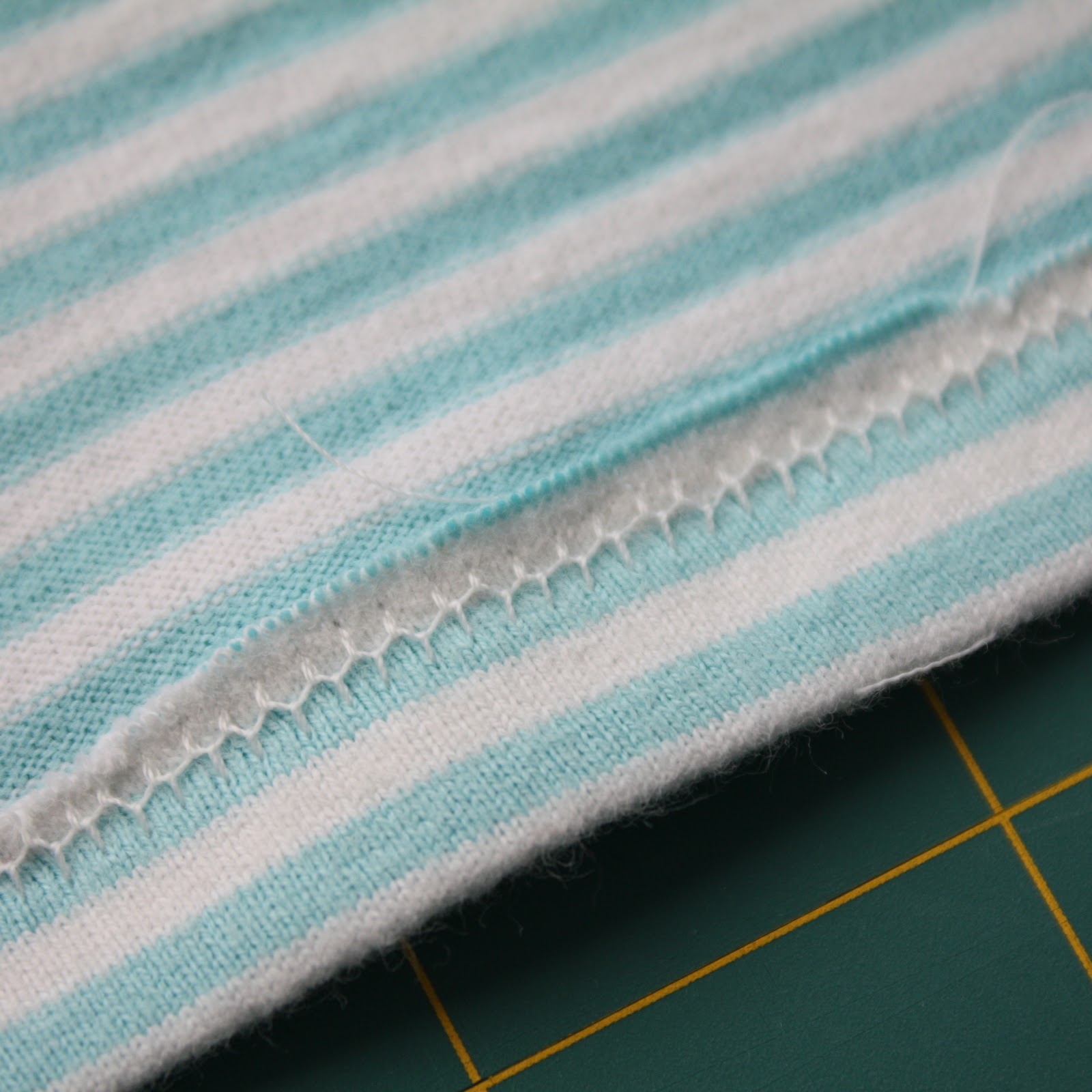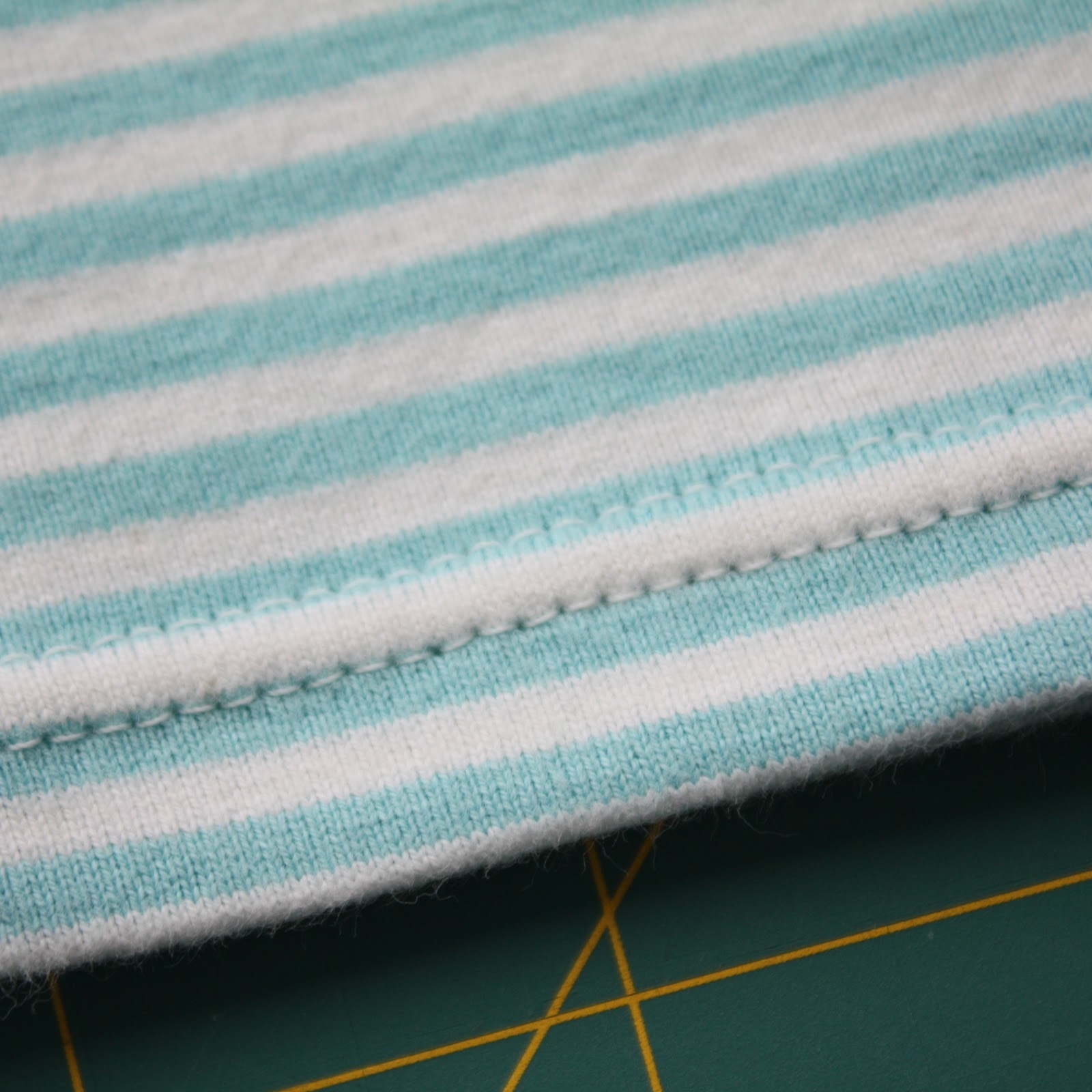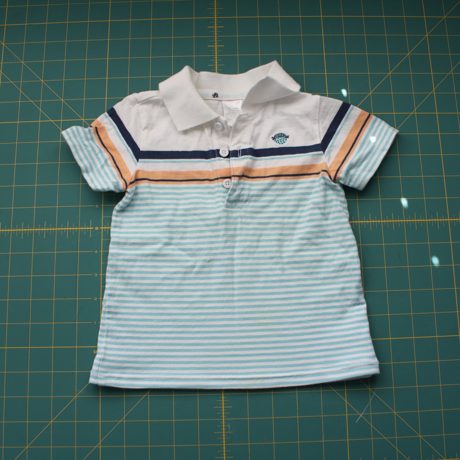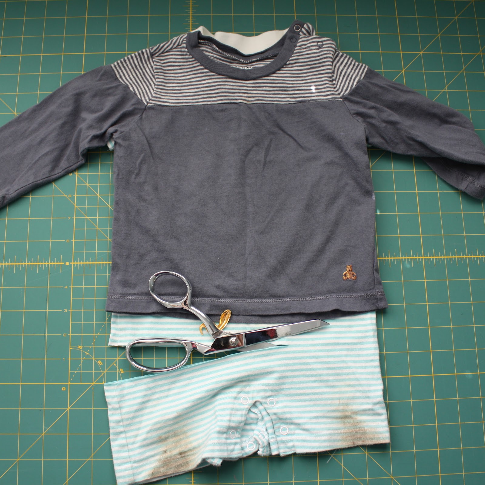 I had stashed it away, planning on converting it to a t-shirt. Even if he hadn’t completely ruined the little legs on it, I might have cut it off anyhow to buy a little more time in it once he grew out of the length. So measuring against another top, I cut off the bottom, pressed and top-stitched with my double-needle.
