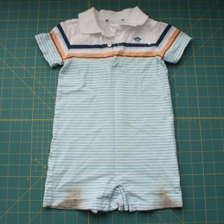 After a couple of pretty intensive sewing projects (this skirt and another one to be revealed shortly), I was feeling a bit burned out. Sometimes it’s nice to just have a quick, simple, no-thought-needed project for a change! While organizing my fabric bins, I found a romper that my little one had destroyed while playing in the mud. (Yes, it has been washed.)