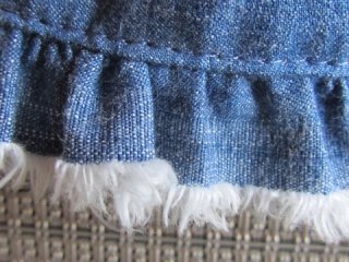 This is the description she gave of the skirt:  “Made of ultralight 100% cotton denim fabric.  Pull on straight skirt – no pockets, no zipper, no waistband, no nuthin’.  Ruffle is made with the selvage edge of the fabric – reminding me of cutoff jeans shorts with a little fringe.”