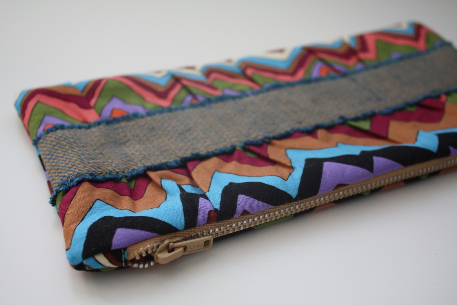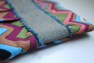 I’ve been seeing this gathered clutch by Anna at Noodlehead in so many posts lately. It’s a completely incredible and beautiful bag (which I’ve made several times, here and here) and I hopped on the bandwagon again because a good friend sadly misplaced the one I made for her. When she said it was lost, I interrupted her sentence to offer to make a new one because they are that much fun (and quick, and easy, and cute…). My friend has been doing “textile art”, using beautiful fabrics to create abstract wall art, so I borrowed her aesthetic as inspiration for this one. Instead of the band described in the original pattern, I used an upholstery-weight woven fabric, and frayed the edges. I applied it with the reverse side of the fabric outward, so you can see the contrast better.