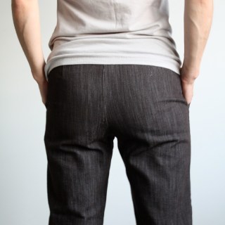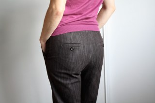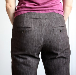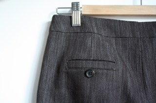 So I’ve worn my new pants a couple of times and I have to say, I was feeling pretty self-conscious of the broad, unbroken expanse of fabric covering my rear end. I had only the smallest swatch of fabric left, so I did the only thing I could do and made the decision to sew in some faux single-welt pockets.