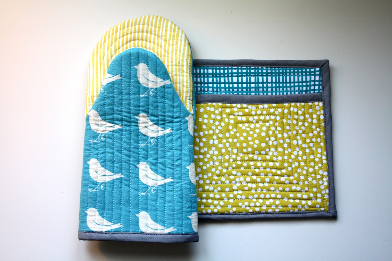 The new challenge is “to create two projects that coordinate or reference one another through the use of color”.   We chose yellow, turquoise and hints of gray as our color palette, with diverging projects: Jenny is working on sewing room accessories, and I need to replace some of my worn-out kitchen accessories.  Without getting into too much more detail (I’ll wait to the big reveal for that), here’s what I’ve been working on–oven mitt and hot pad.