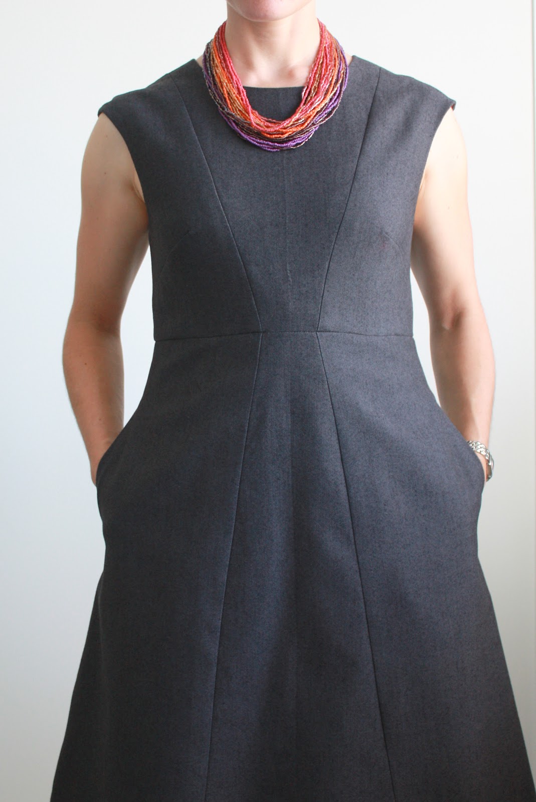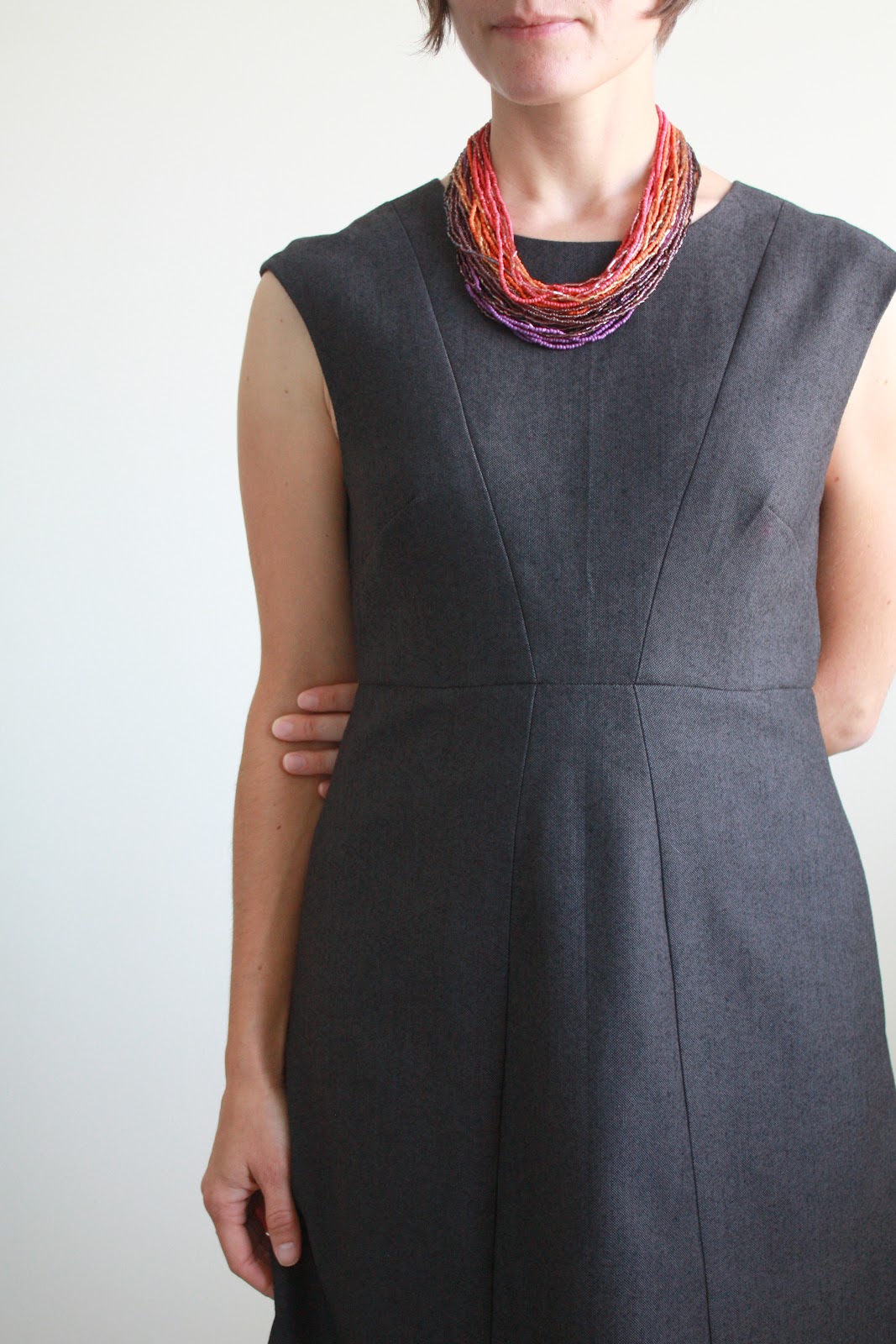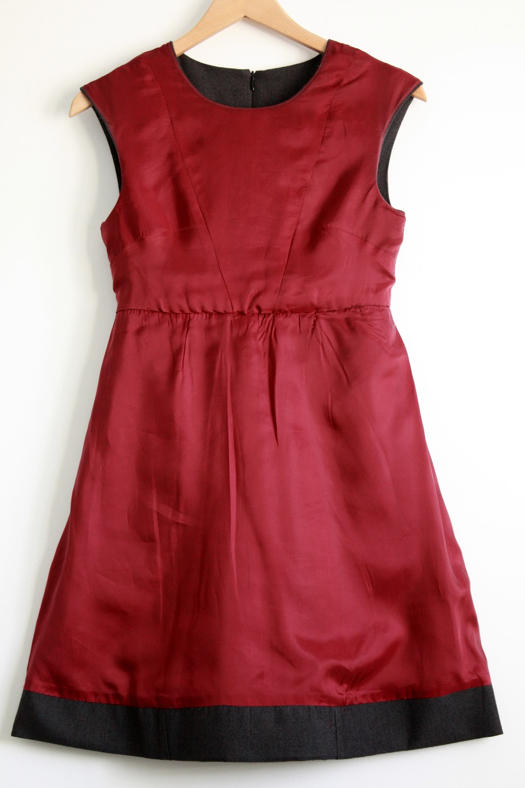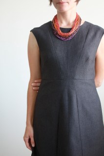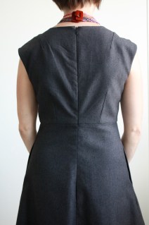 The pattern is Vogue V8755 with heavy charcoal cotton fabric. It truly has the heft and appearance of wool, but I’ll trust that Britex knows their fiber content! The lining is burgundy Bemberg, which is truly a fabulous, incredible lining fabric. I followed the pattern instructions pretty closely, but I omitted my usual petite adjustment in the bodice, because I didn’t want the maternity effect of an empire waist and belly pleat. After constructing the shell, the belly pleat was really awkward looking (I think my fabric was a bit too heavy for the design, actually), so I sewed along the pleat lines to make it much more streamlined and architectural looking–I love it!