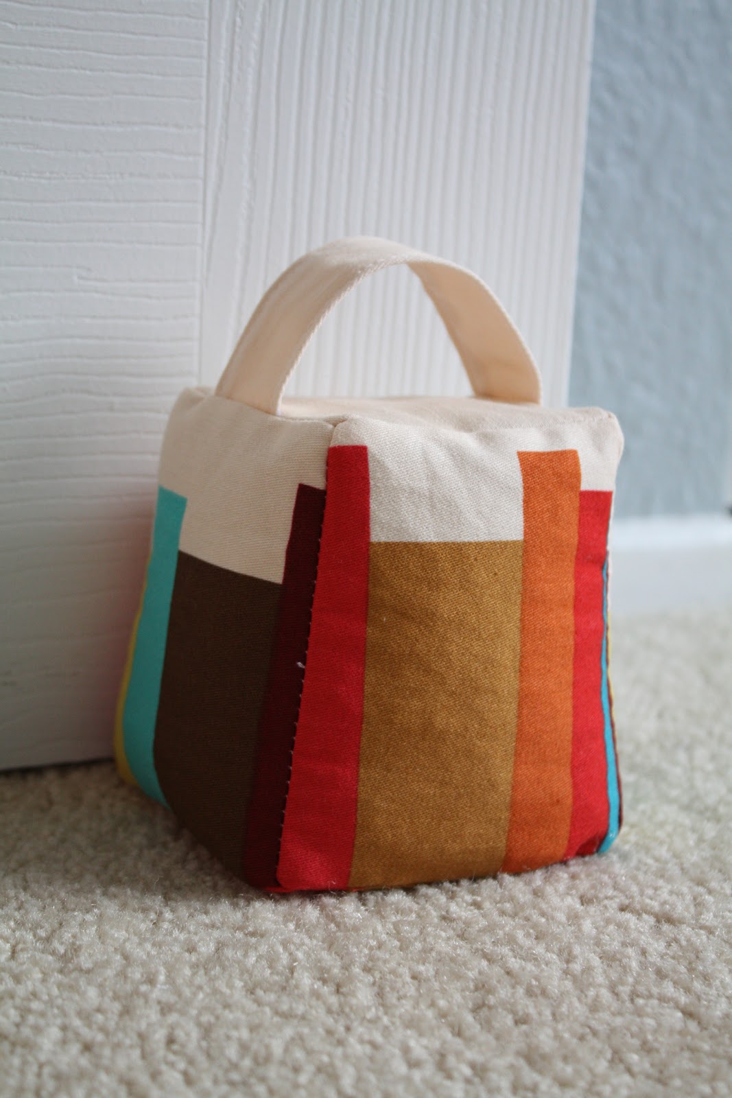 First up: a door stop. We can keep our windows open much of the Fall, but a gust of wind can slam my sewing door shut suddenly, and obviously this only happens during nap or bed-time. I’ve used the adorable pattern for the door stop from Lotta Jansdotter’s book Simple Sewing several times before, so I pulled out the tried-and-true pattern to construct a new version to match the color scheme in the sewing/ spare bedroom. I scaled the pattern by 50% (I think), so it’s a bit more petite, but holding over a pound of beans it can still do the job.