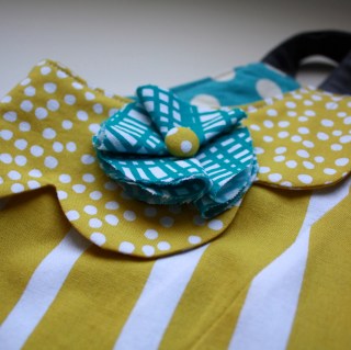 And here’s a close up of the boutonniere, which was made from four folded circles of fabric, sewn together at the center with a fabric covered button. Easy!