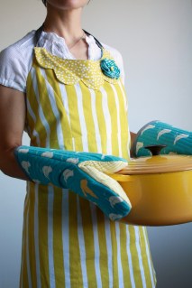 I wanted to replace some well-worn kitchen items, so my half of the Buddy Project was to make oven mitts, pot holders, and a new apron. My kitchen is pretty neutral, but I have yellow as the main accent color, with a bit of turquoise thrown in there for fun. I loved bold designs of these Lotta Jansdotter fabrics: