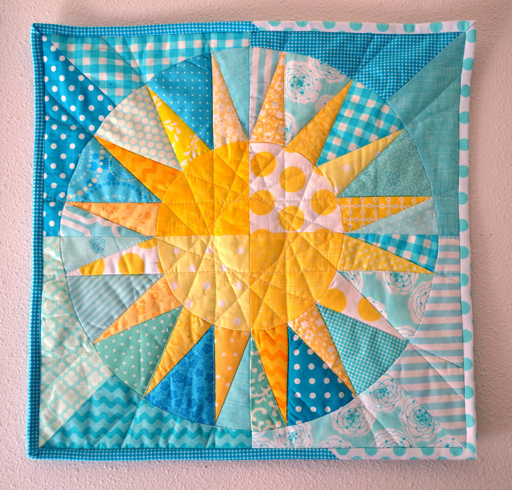 Look at all that work! I love the beautiful handmade piping, sweet buttons and fabric tape measure detail. Just in case her space wasn’t cheery enough with those lovely pieces, she also whipped up a sunny wall hanging: