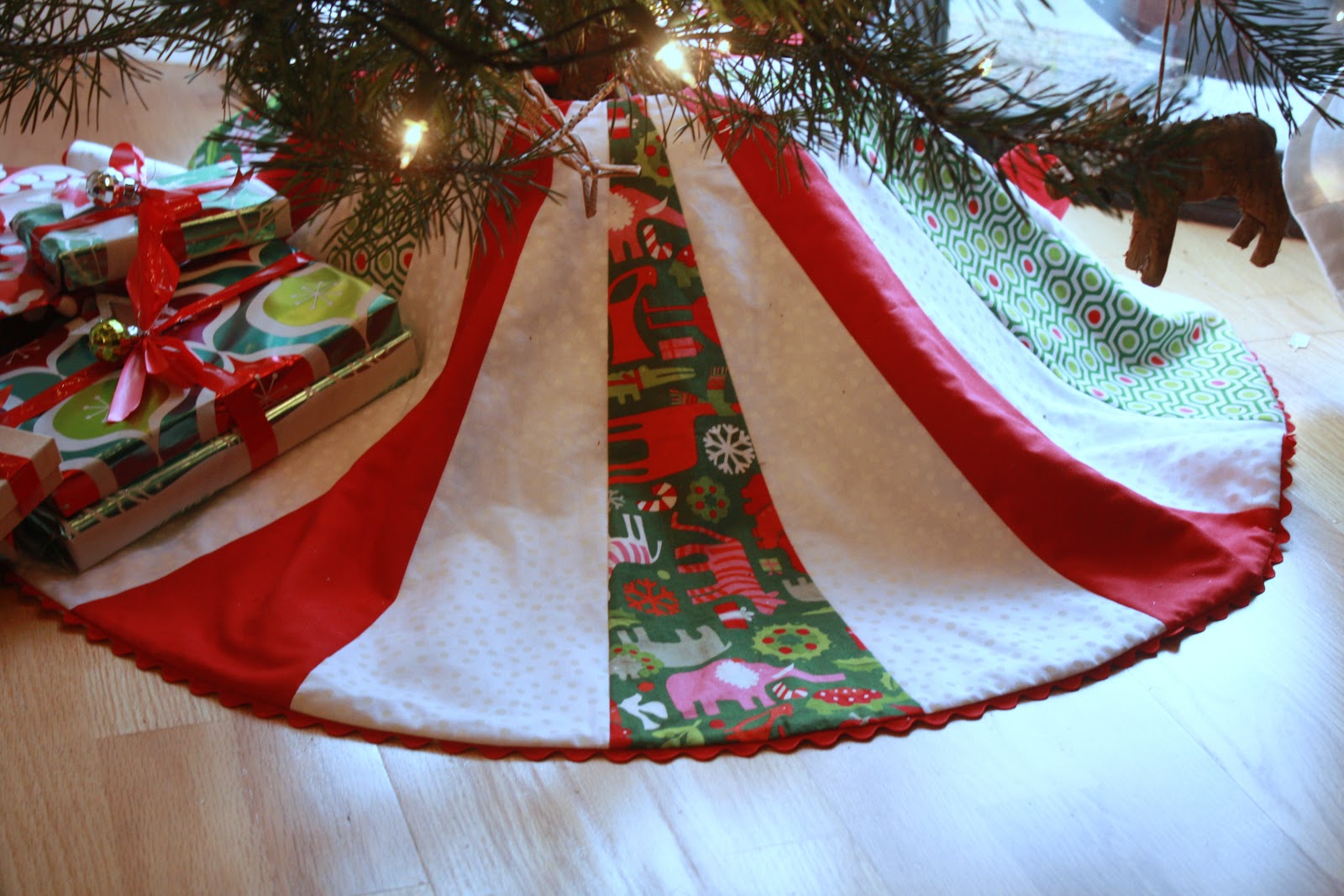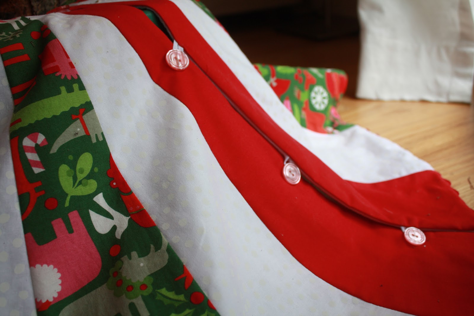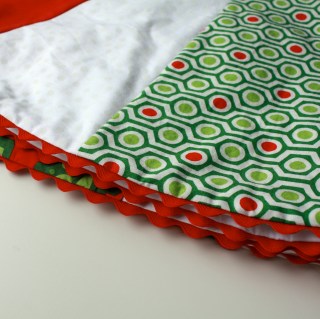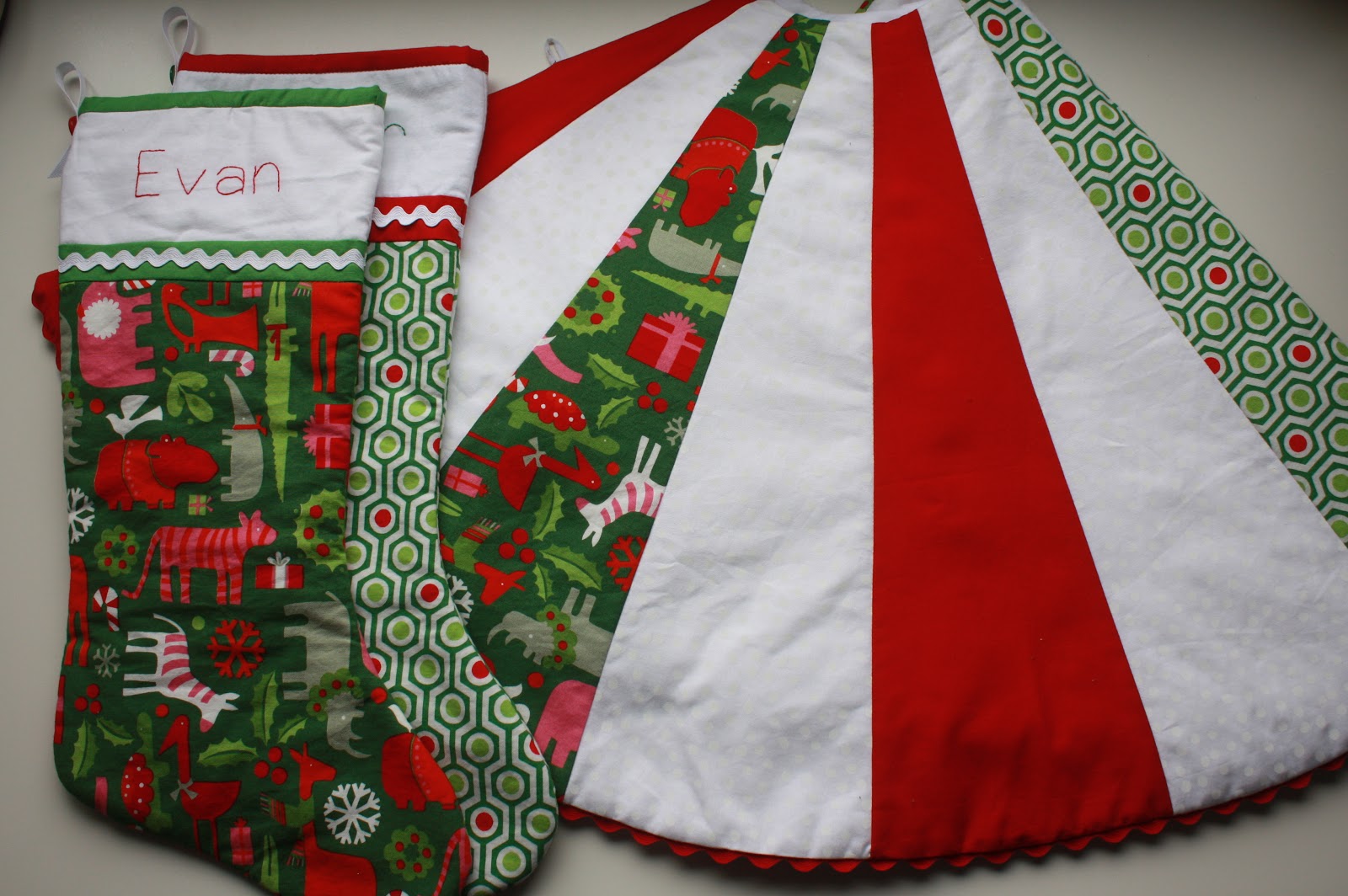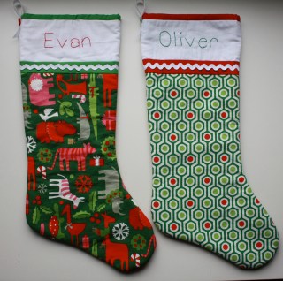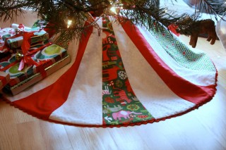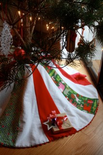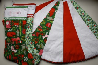 After seeing this tutorial, it was immediately imperative that I make a tree skirt. Not that we needed one; on the contrary, I own a beautiful skirt with rows and rows of cute little pompoms that I actually like quite a bit. No, I had to make one because despite not being a matchy-matchy type of person, I had some extra fabric left over from the stockings I made for the boys in previous years and I just really wanted it to be made-by-me! Here’re the boys’ stockings (I designed them myself, so no pattern to reference):