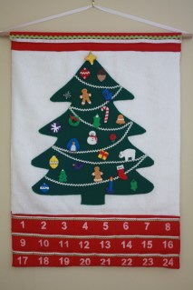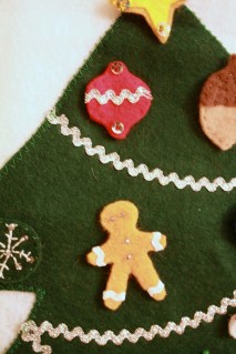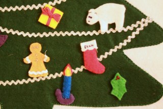 Hands down, my favorite decoration for the house is this advent calendar, made three years ago. I based it on my in-laws wood version, but ours is all felt, with tiny rick rack, ribbon and seed bead decorations for the ornaments. Clearly made before child #2 came along, each number was hand cut with an exact-o knife from freezer paper and then stenciled. I still can’t believe I went through all that trouble!