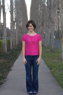 Since I’m a part-time instructor at a local community college, I try to step up my wardrobe a little bit; I’m young-looking and a small person, so I have to make an effort to not look like a student! I had been wanting to recreate a ready-to-wear top that fit well, and the partnership with Britex provided a great opportunity to work with one of their incredible solid-colored silks. I won’t lie; silk is waaaay out of my comfort zone, but I was excited for a challenge. I chose this Italian-made geometric jacquard because I loved the modern look of the woven pattern and the bright pink color was so vibrant. I have to stand in front of a classroom full of students, so I don’t want to blend into the blackboard!