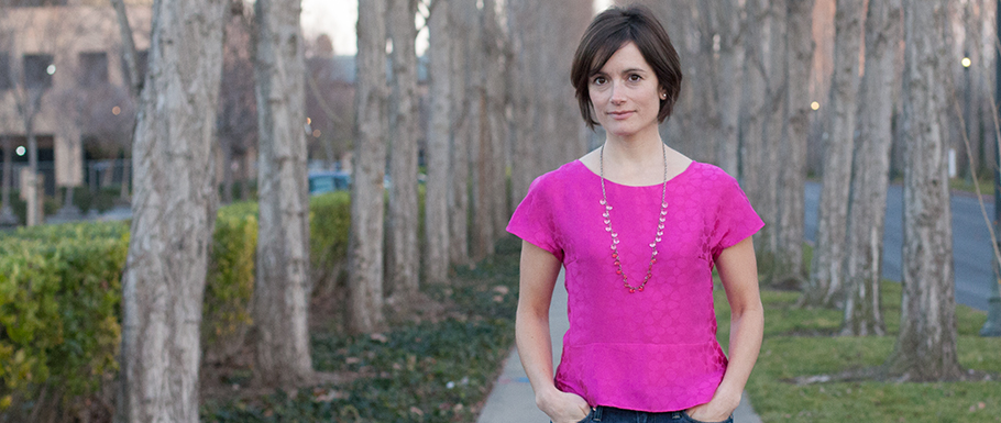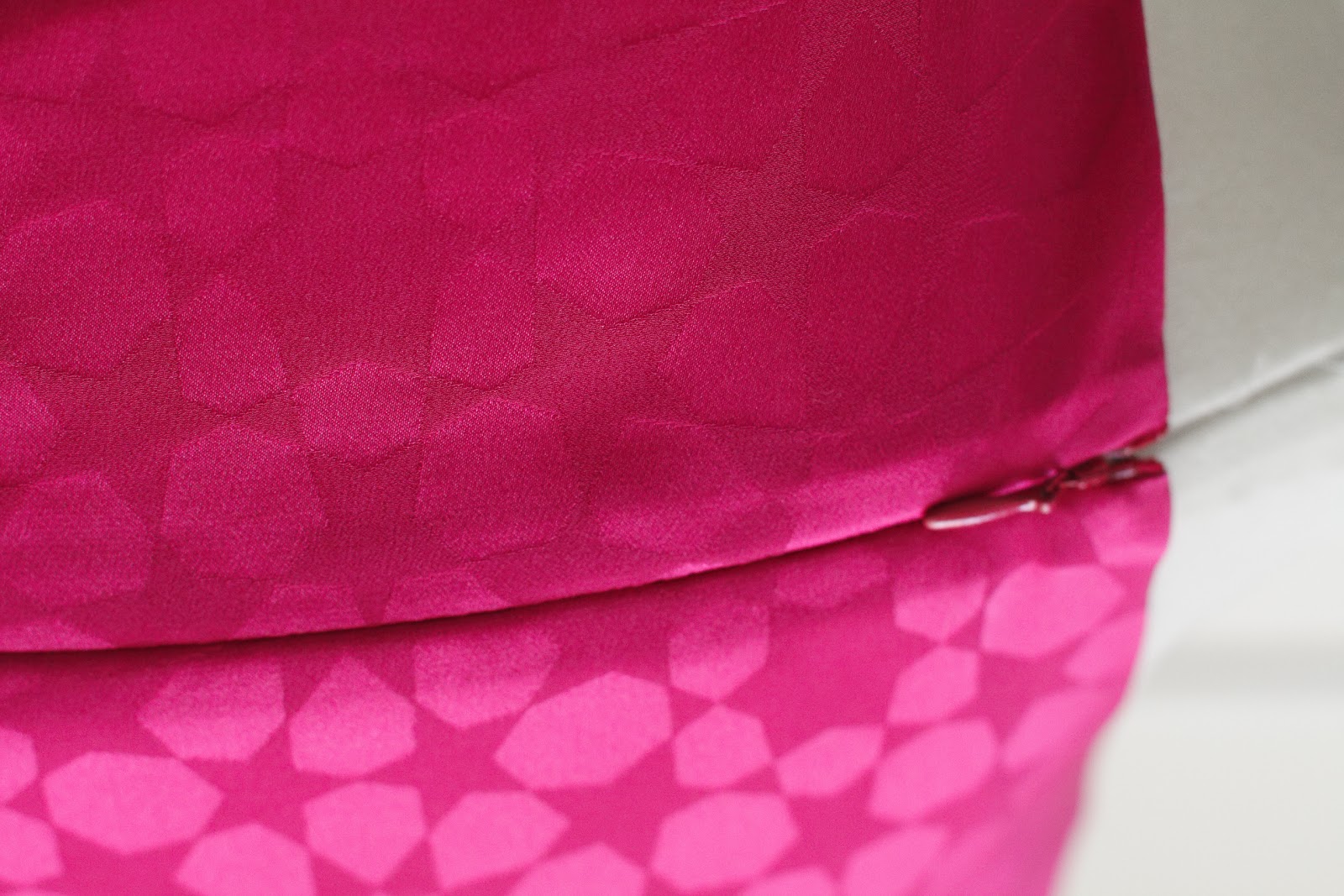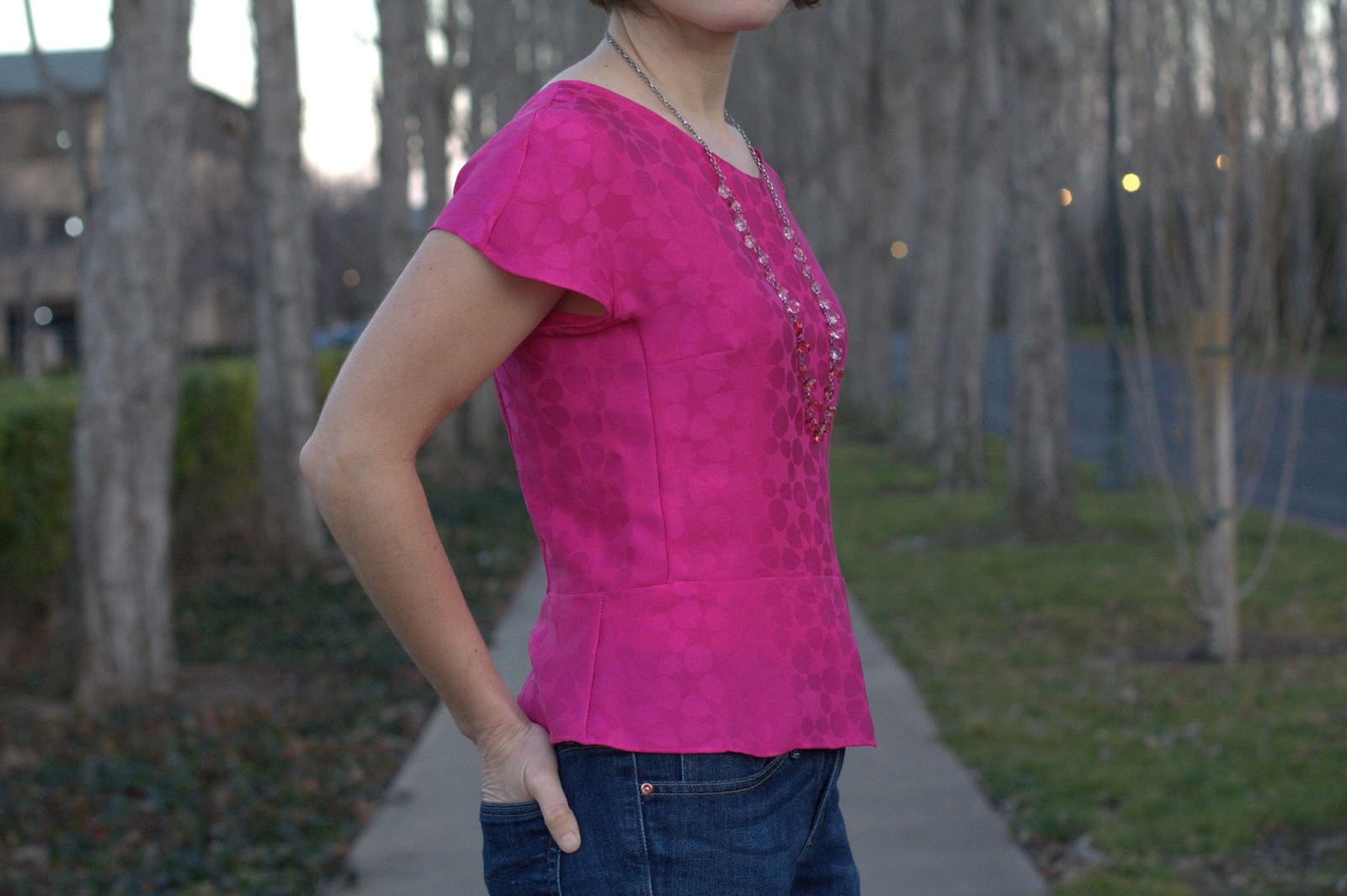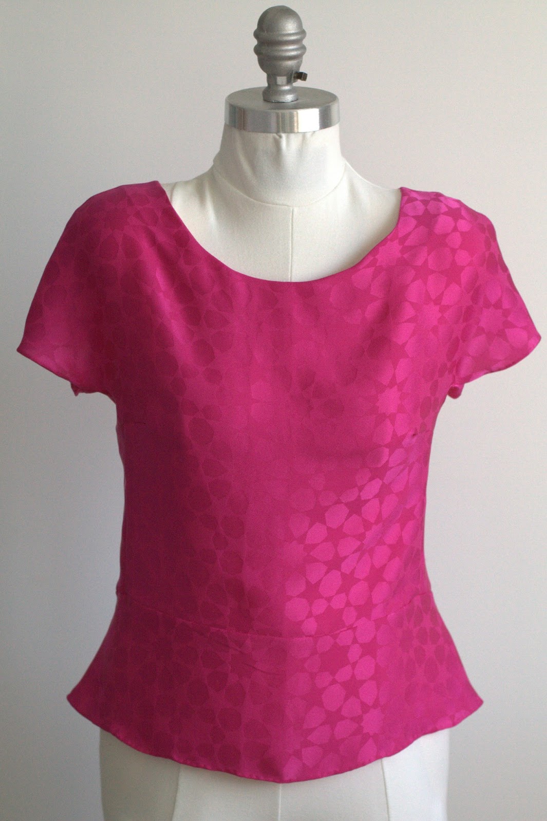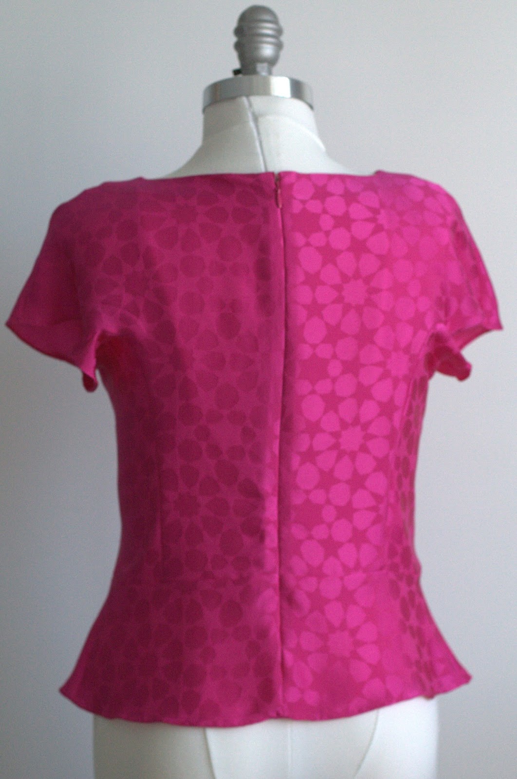 Since I’m a part-time instructor at a local community college, I try to step up my wardrobe a little bit; I’m young-looking and a small person, so I have to make an effort to not look like a student! I had been wanting to recreate a ready-to-wear top that fit well, and the partnership with Britex provided a great opportunity to work with one of their incredible solid-colored silks. I won’t lie; silk is waaaay out of my comfort zone, but I was excited for a challenge. I chose this Italian-made geometric jacquard because I loved the modern look of the woven pattern and the bright pink color was so vibrant. I have to stand in front of a classroom full of students, so I don’t want to blend into the blackboard!