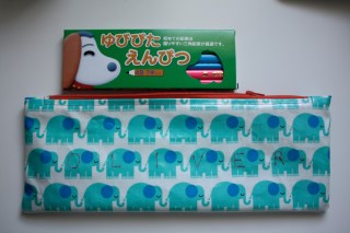Last week, my younger son had a special package hand-delivered from Japan–a big box of worksheets and activities (which the company would not ship to an American name!) for use at his daycare. Included in the package was a set of adorable pencils, not round by “sankaku” (triangle). The daycare requested a pencil case, and of course, I was thrilled to have a simple and cute project to work on. I was set on sewing my son’s name onto the case, one letter per elephant, which made it comically large for the pencils it was to hold: