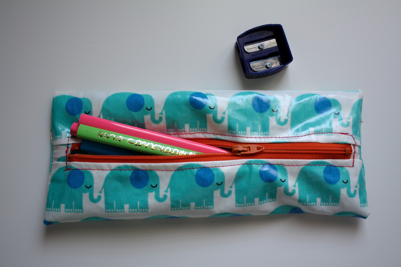 Last week, my younger son had a special package hand-delivered from Japan–a big box of worksheets and activities (which the company would not ship to an American name!) for use at his daycare. Included in the package was a set of adorable pencils, not round by “sankaku” (triangle). The daycare requested a pencil case, and of course, I was thrilled to have a simple and cute project to work on. I was set on sewing my son’s name onto the case, one letter per elephant, which made it comically large for the pencils it was to hold: