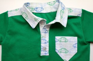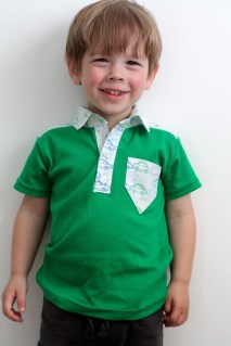 The pattern comes in a wide size range, so with the one download, I can make perfect polos for both my nearly 3 and nearly 8 year olds. The styling is modern and uses knits (for comfort!) and woven fabric as trim (for cuteness!). The directions are easy to understand and follow, and I whipped up this guy in about 3 hours, which included ripping out the collar and making a new one. Not bad!