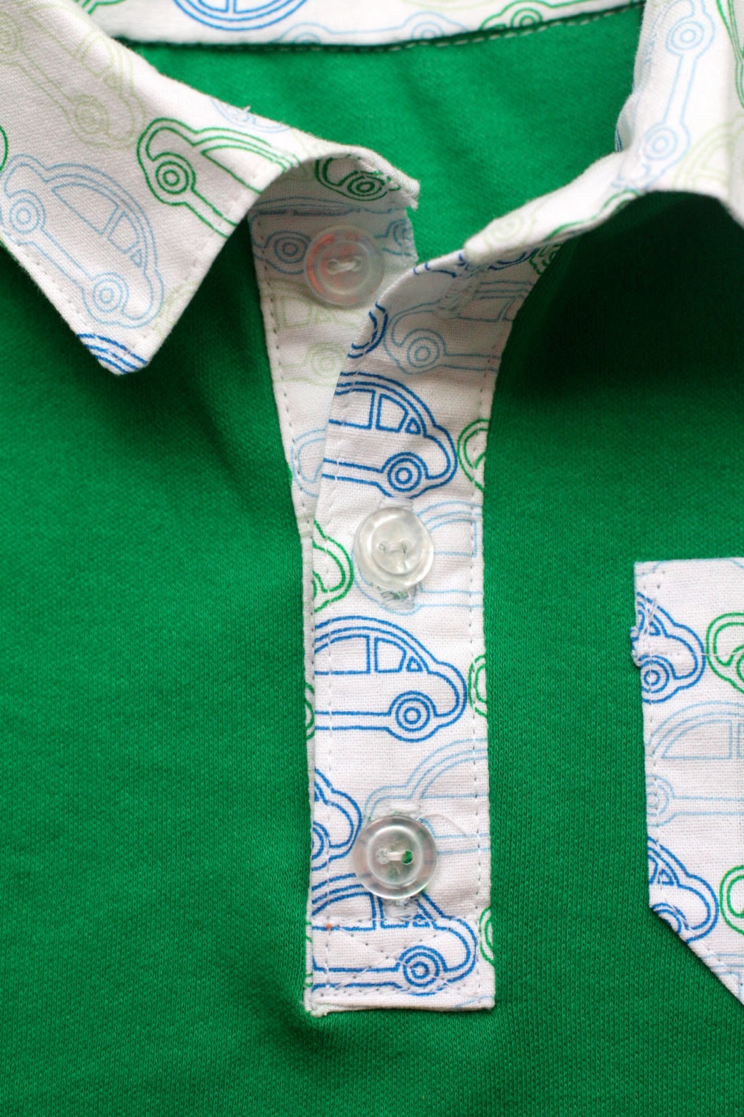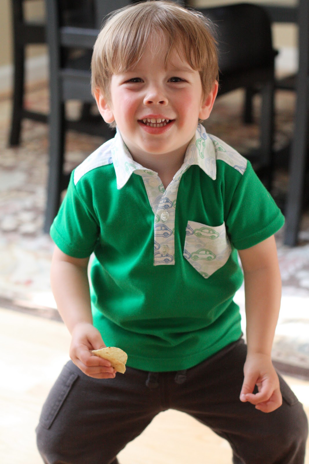 The pattern comes in a wide size range, so with the one download, I can make perfect polos for both my nearly 3 and nearly 8 year olds. The styling is modern and uses knits (for comfort!) and woven fabric as trim (for cuteness!). The directions are easy to understand and follow, and I whipped up this guy in about 3 hours, which included ripping out the collar and making a new one. Not bad!