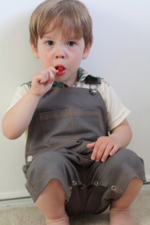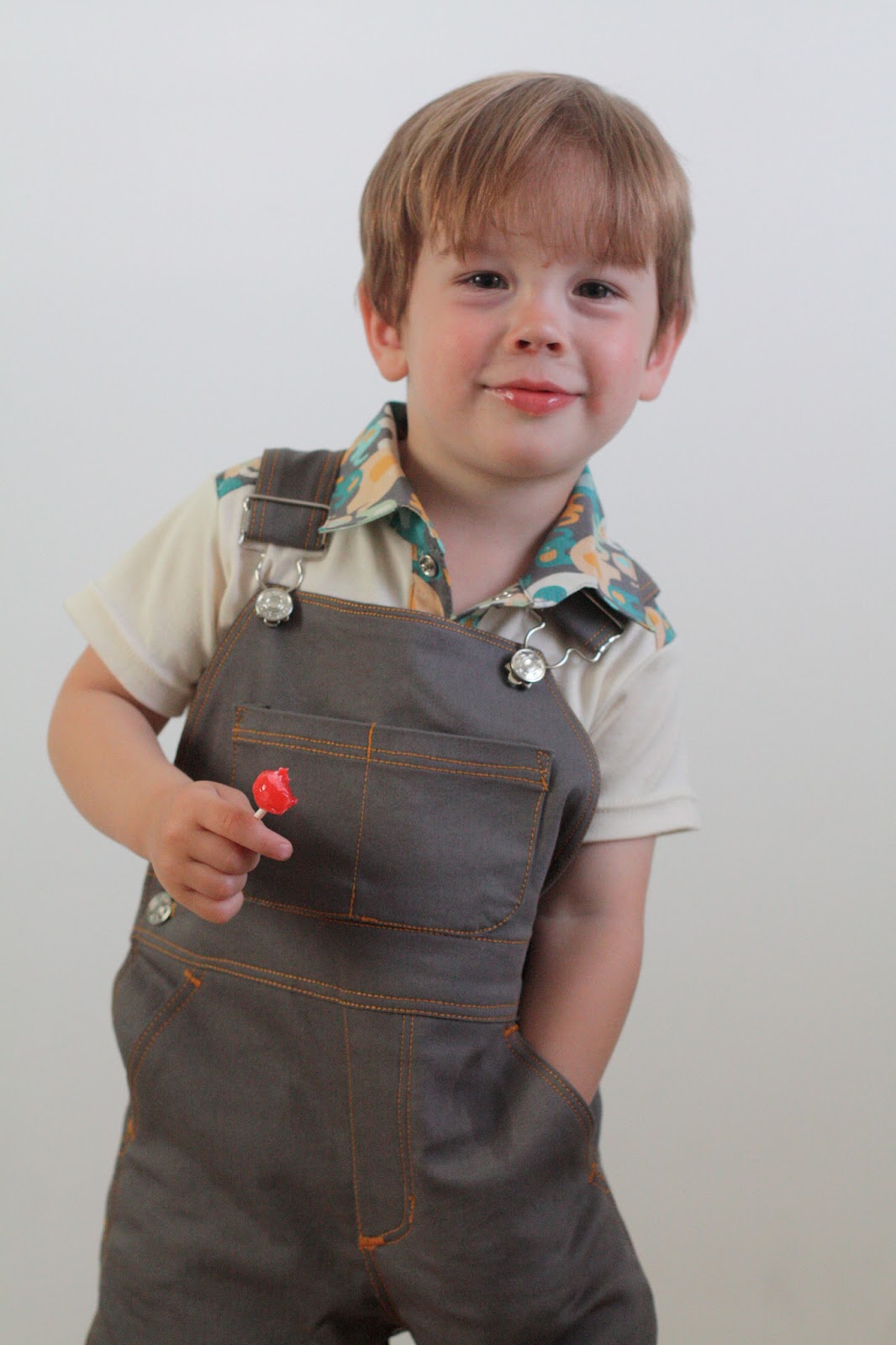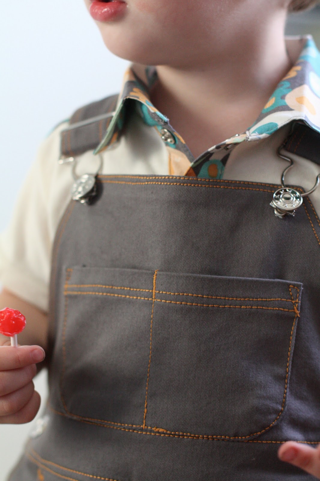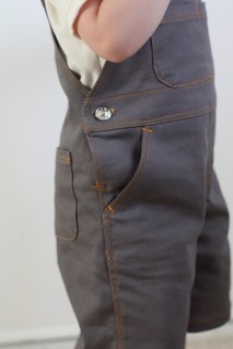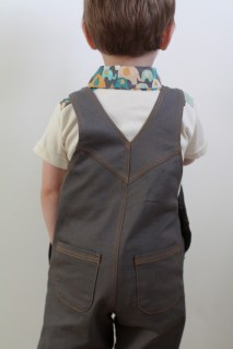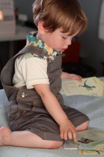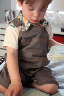 I got started on one final project for Spring Kid’s Clothes Week on Friday, a pair of overalls for my little man. After working on them for what feels like an eternity, I finally finished them today (just a day overdue :). Between constantly switching between regular and topstitching thread, having to sew each seam three times, and all the other details that went into these short-alls, they are seriously one of the most involved articles of clothing I’ve ever made. But look how cute! And they fit!
