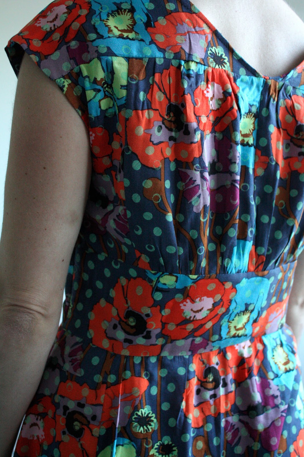 Some projects take longer than others. Some walk that fine line between “worth finishing” and “garbage-worthy”. Case in point: this dress. This dress hovered over the trash can on numerous occasions. So many ripped out seams, so many alterations, so many changes to the construction. The pattern (Vogue V1086, by Tracy Reese) had sketchy instructions (“sew {this impossible} seam as show in the {single, oversimplified} drawing”). It had no final garment measurements and strange construction. Initially, I had high hopes when I saw that the instructions specified French seams, but it all went downhill from there. Among other changes, I raised the neckline by multiple inches–my less than abundant chest couldn’t fill out the very blousy and full bodice. I know–I should know better by now what works on my body, but we can all hope, right? Omigosh–and no pockets! And I couldn’t even work them into the design because of a side zipper.