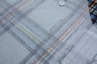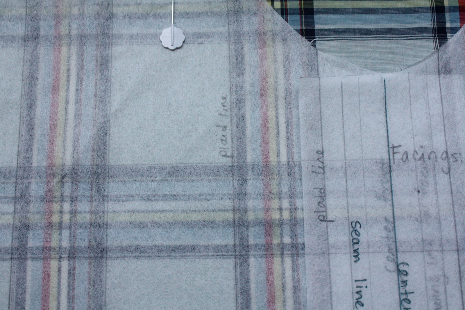 Using a straight edge, trace the plaid lines onto your pattern pieces, in both the horizontal and vertical directions. Do not unpin the pieces, just draw straight across the overlapping sections. You may want to label the plaid lines, particularly if there are multiple designs in the plaid pattern.