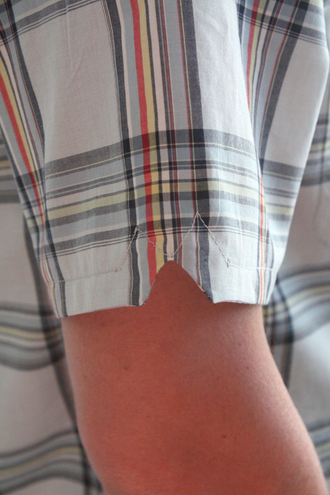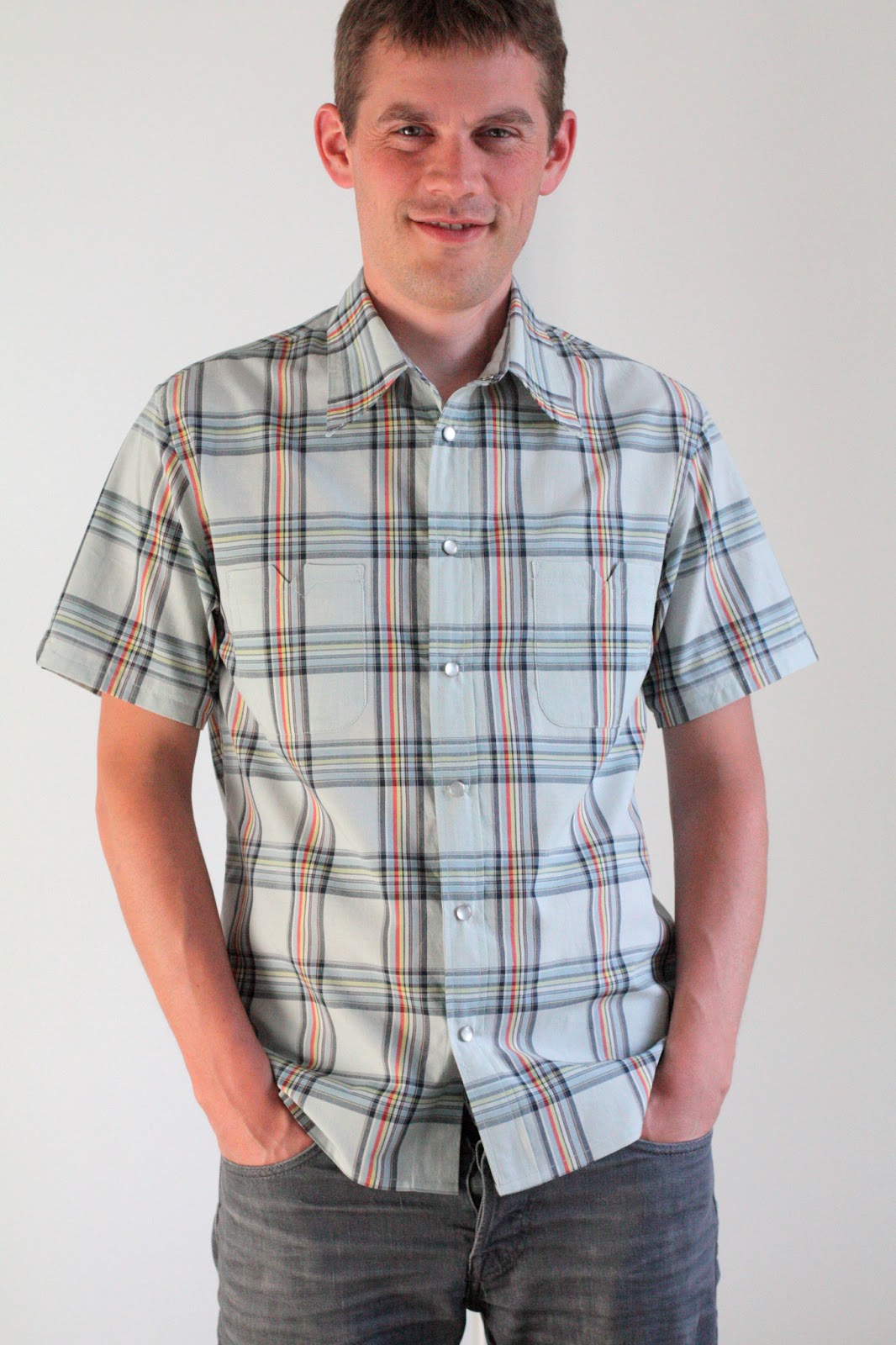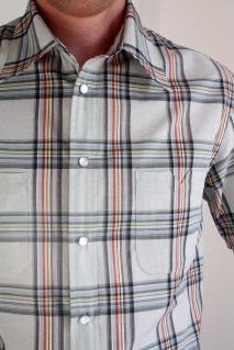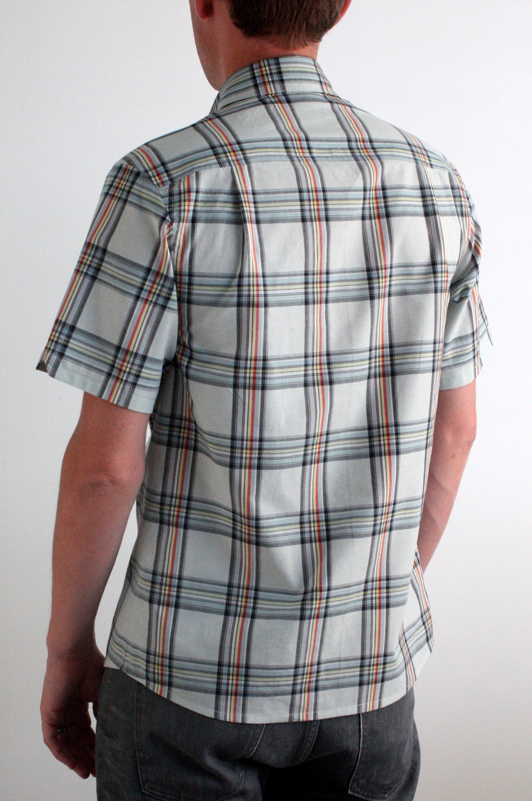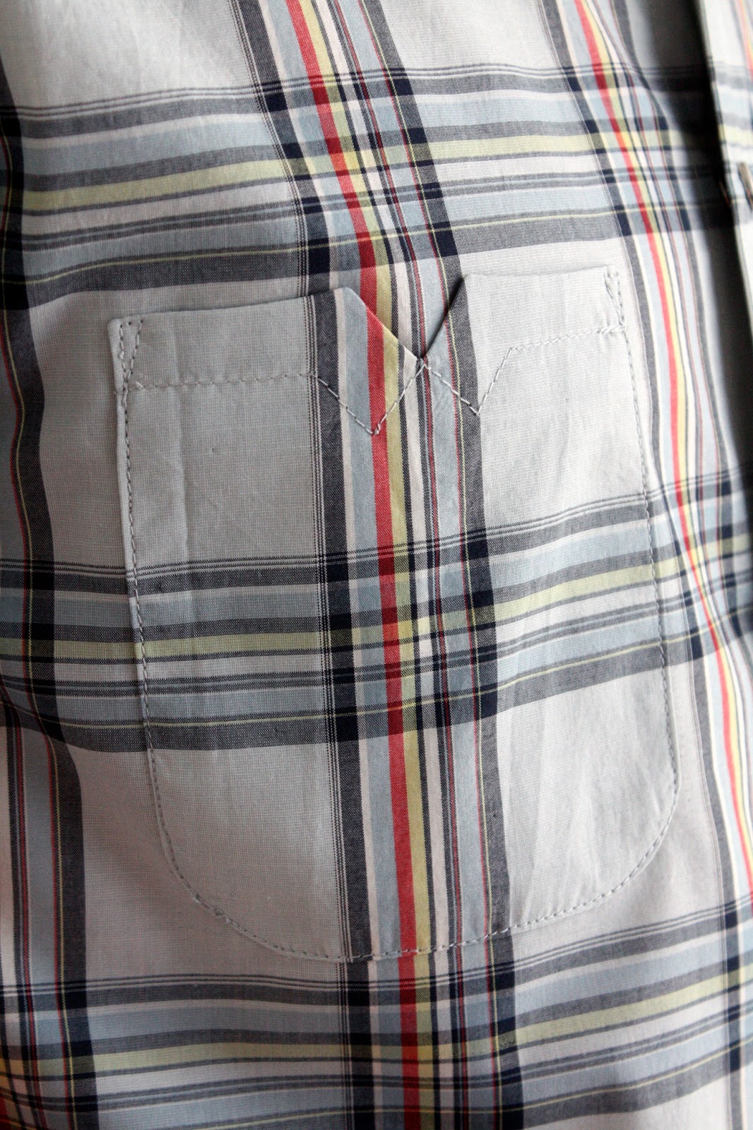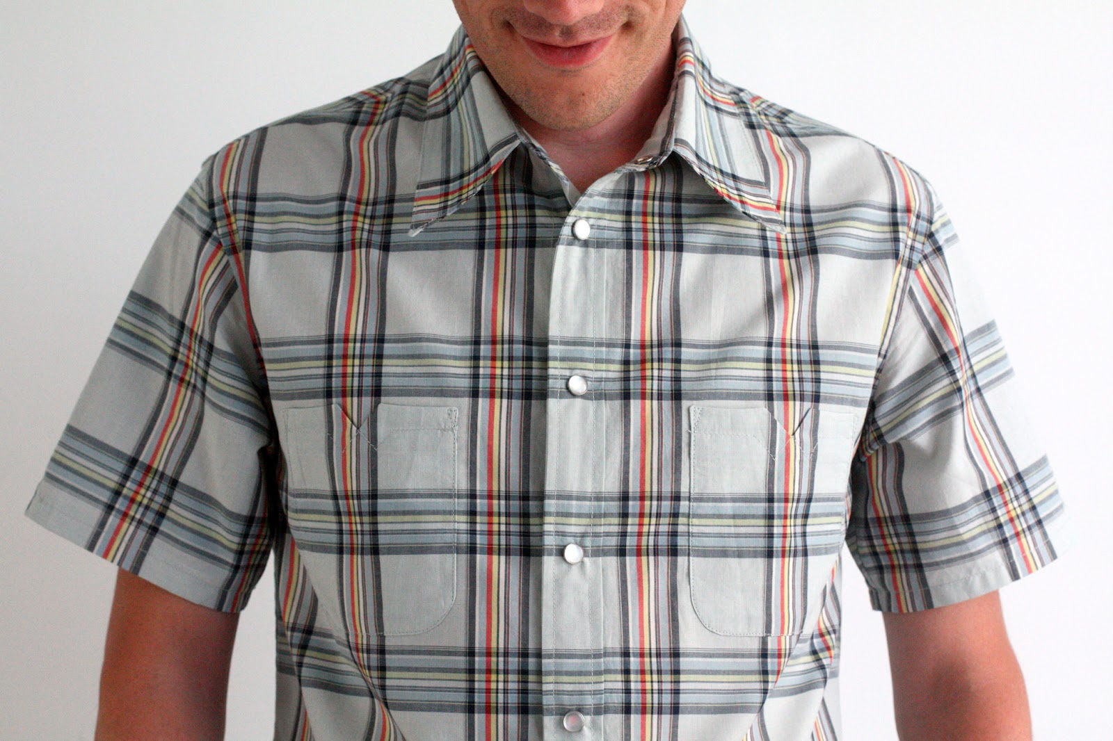 When I discovered the beautiful and vintage-y modern plaid at Britex, I knew I had found the fabric for which I had been searching. I had in mind a short sleeve button-up shirt for my husband, but wanted something different than classic dress shirting. This fab plaid completely fit the bill! However, once I laid out the fabric and went to cut out my pattern, I realized I had a big challenge ahead of me. Plaid. Matching plaid is one issue; deciding in which direction the plaid should be arranged and the overall layout was the other. Should the plaid on the yoke be diagonal? If the yoke is on the straight grain, could the pockets be diagonal? What about the placket?? I was completely paralyzed by indecision for a while, but after looking at some ready-to-wear men’s tops, I opted to go for a straight-laced version with no diagonally arranged plaid pieces. Really working the 70s vibe of the fabric might look great, but I wanted to be sure my husband would actually wear the shirt!