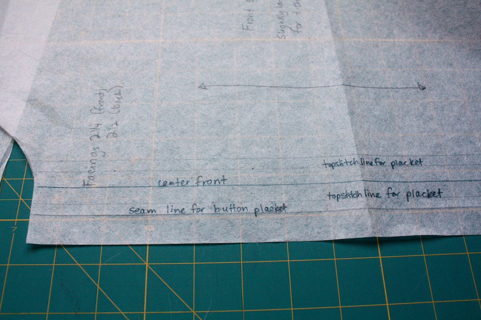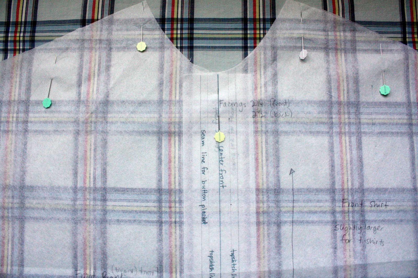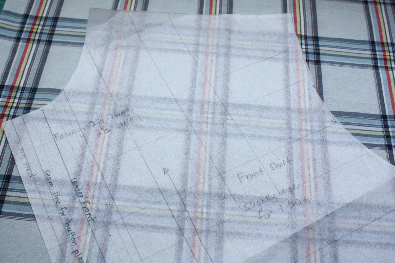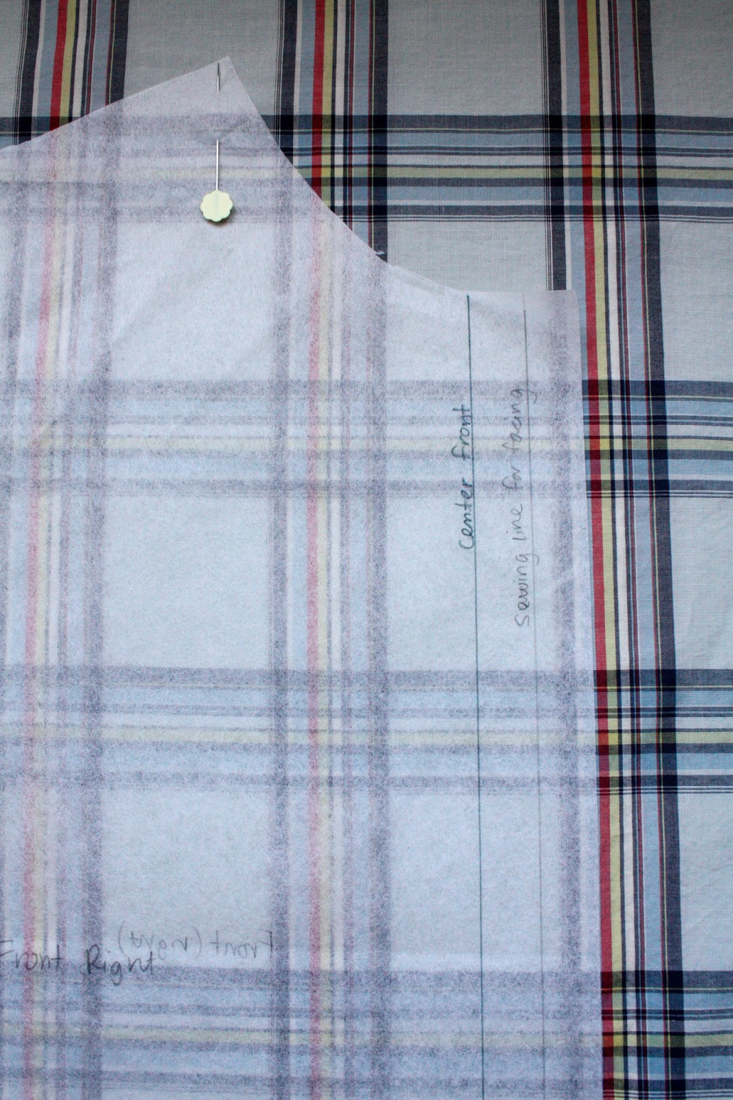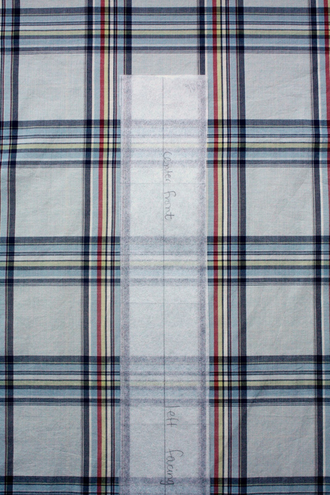 To keep the plaid continuous across the front, the first order of business is to identify the center front on each of the three main pieces: left and right front pieces, and button placket. If your pattern does not have separate left and right pieces (the Negroni pattern does not), trace the piece so you have two separate pattern pieces.