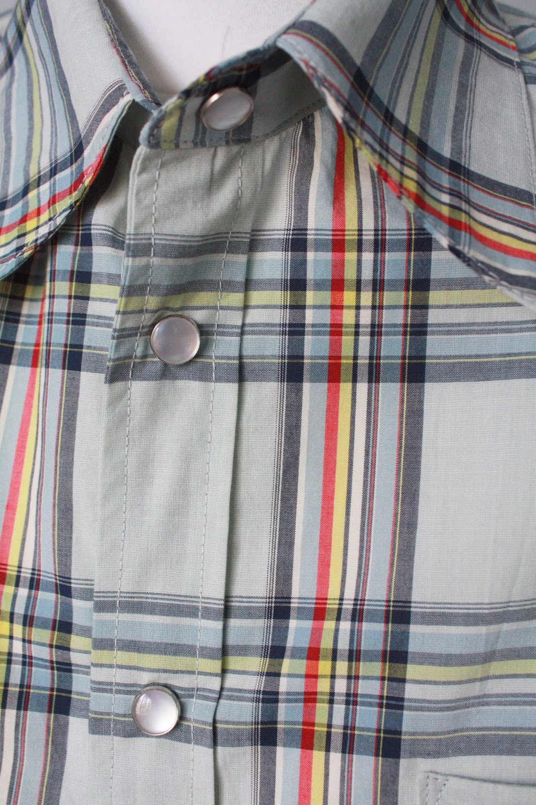 Even though I wasn’t brave enough to go all urban cowboy with diagonal plaids and whatnot, I just had to use pearl snaps, as a nod to the vintage-y feel of the fabric. Snaps vs. buttons are almost a wash in terms of time spent and ease of application, but I felt a little more nervous with the first whack of the hammer than if I were sewing a button hole, since there’s no going back after the snaps embed in the fabric.
