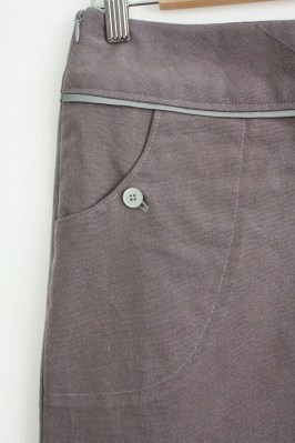 First thing Saturday morning, after a late-night arrival home, I drafted my skirt pattern. For my design, I chose to use a curved yoke waistband which eliminated the need for darts, and added front buttoned pockets. The yoke is detailed with purchased bias tape, used as faux piping. Instead of cutting the front and back pieces on the fold, I seamed up the middle of both to add another design element.
