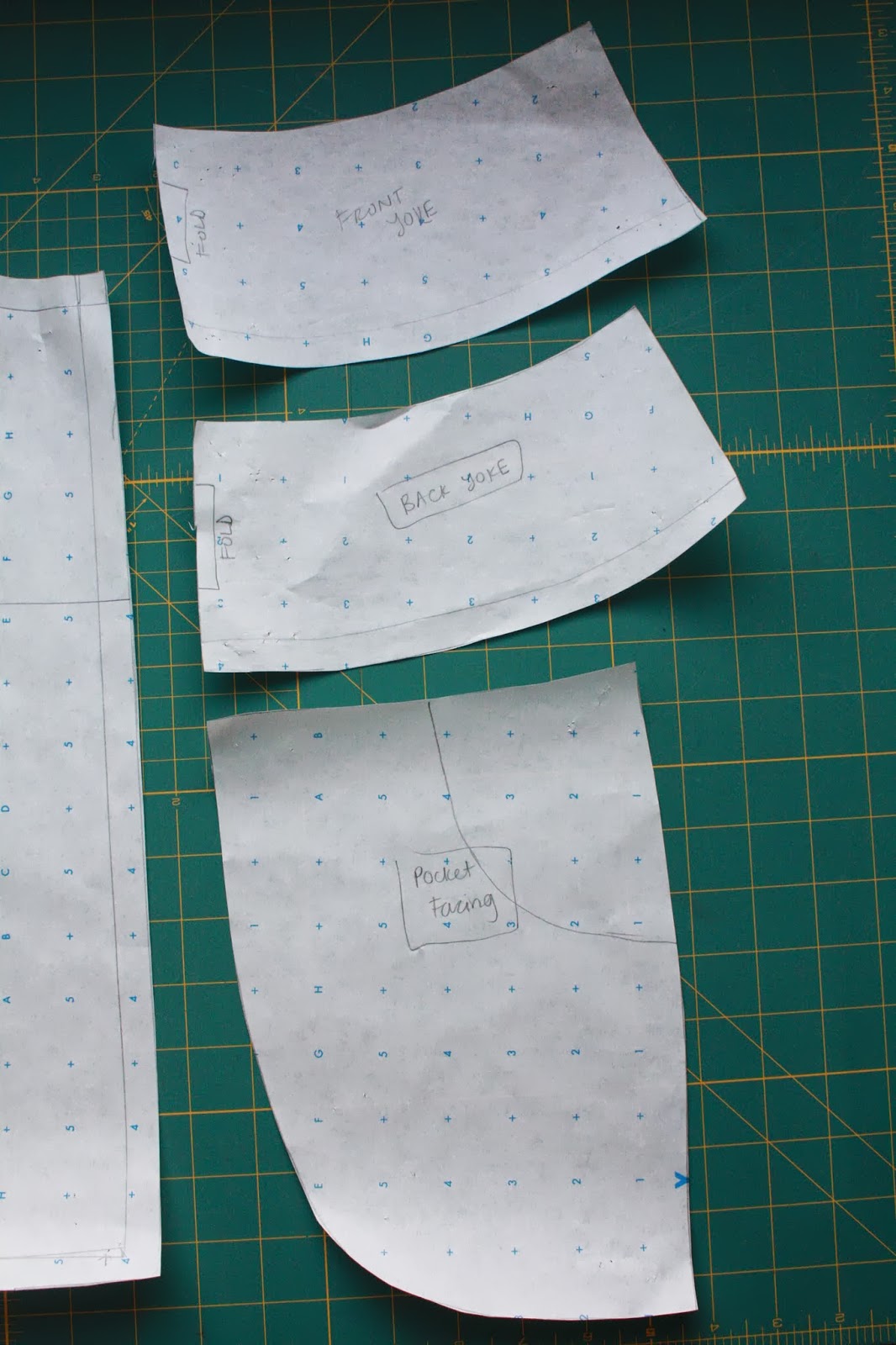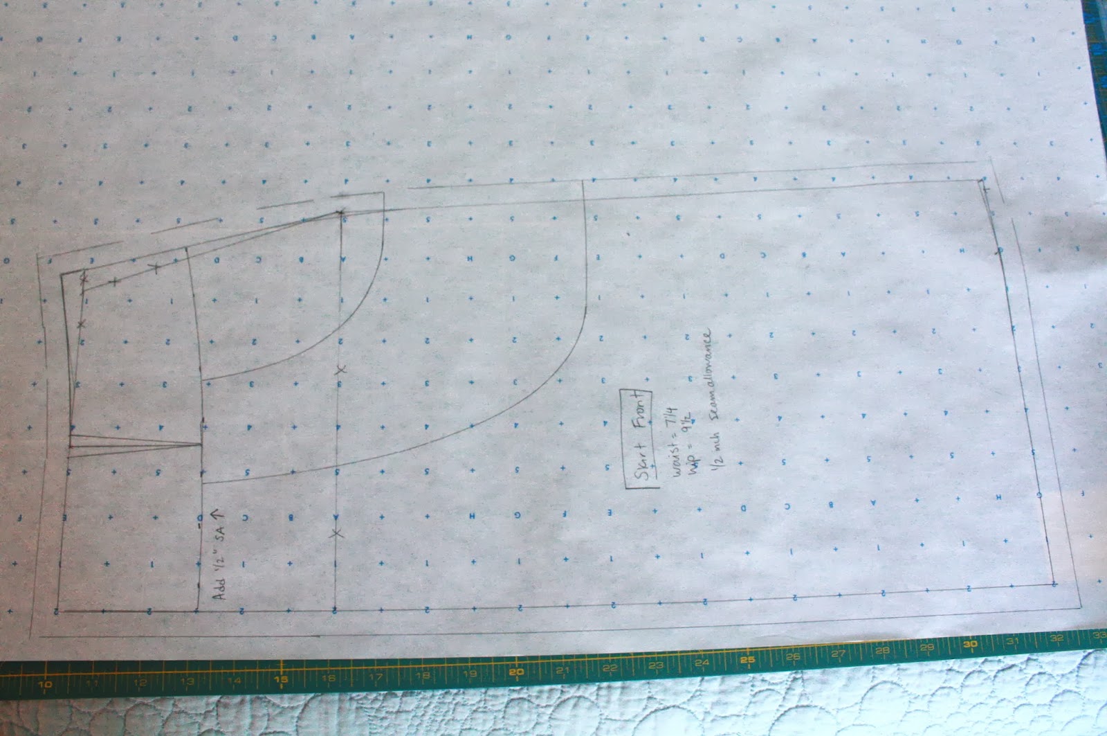 First thing Saturday morning, after a late-night arrival home, I drafted my skirt pattern. For my design, I chose to use a curved yoke waistband which eliminated the need for darts, and added front buttoned pockets. The yoke is detailed with purchased bias tape, used as faux piping. Instead of cutting the front and back pieces on the fold, I seamed up the middle of both to add another design element.