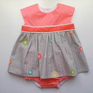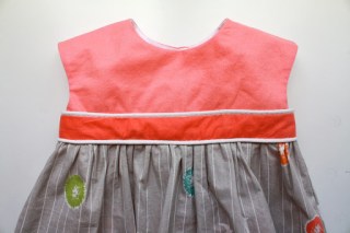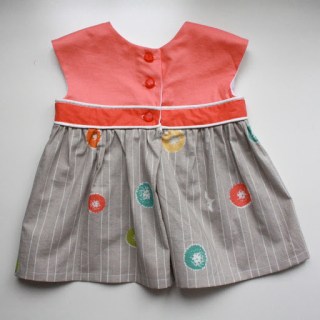 The first outfit was just finished, a variation on Rae‘s Geranium Dress (shirt length), with matching bloomers. How much do I love that gray striped fabric (Dandi Flight by Jay-Cyn) for the skirt? There was only 1/2 yard in my stash, purchased as one of many fabrics for a big boy quilt I have to make eventually, but I think this dress is a much better use for it! The darker melon color of the midriff was leftover fabric from the necklines of my recent Roller Skate Dresses (here and here), and the bodice was the “runner up” fabric that I didn’t end up using for that application.