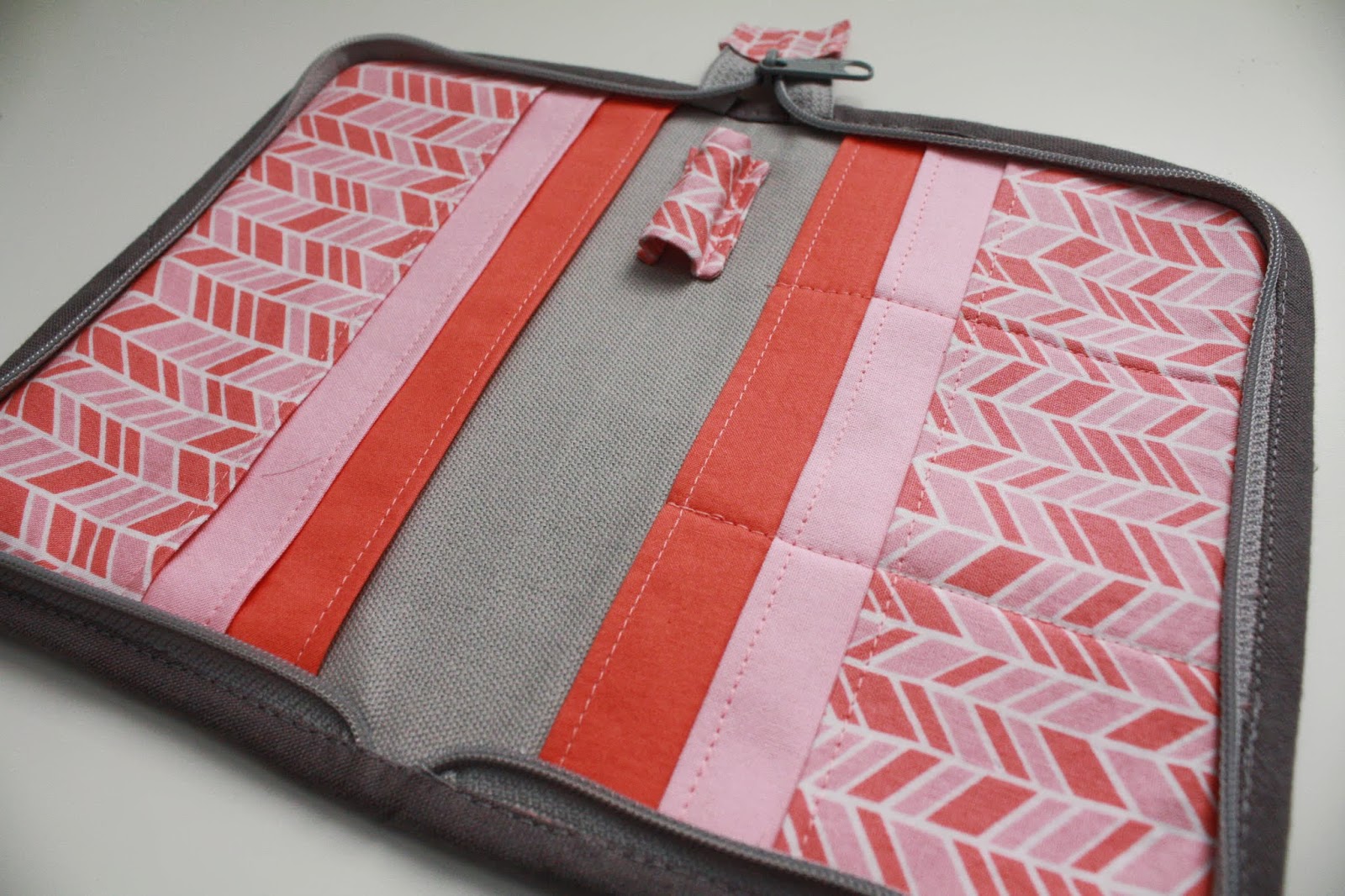 Since making the wallet, I’ve discovered an errata page that accompanies this pattern, but I had to work it out the hard way…so this is what I did: For the undivided pockets on the left (in the above image), I cut three pieces of fabric in the following sizes: coral; 5 3/4″ x 8″, pink; 4 3/4″ x 8″ and patterned; 3 3/4″ x 8 inches.  All pockets were hemmed 3/4″ (as directed in the book, which was apparently changed in the errata).  For the pocket placement (for both sides), I sewed them 1″ from the center, not 3/4″ as directed in the text, and 3/4″ from the previous pocket.
