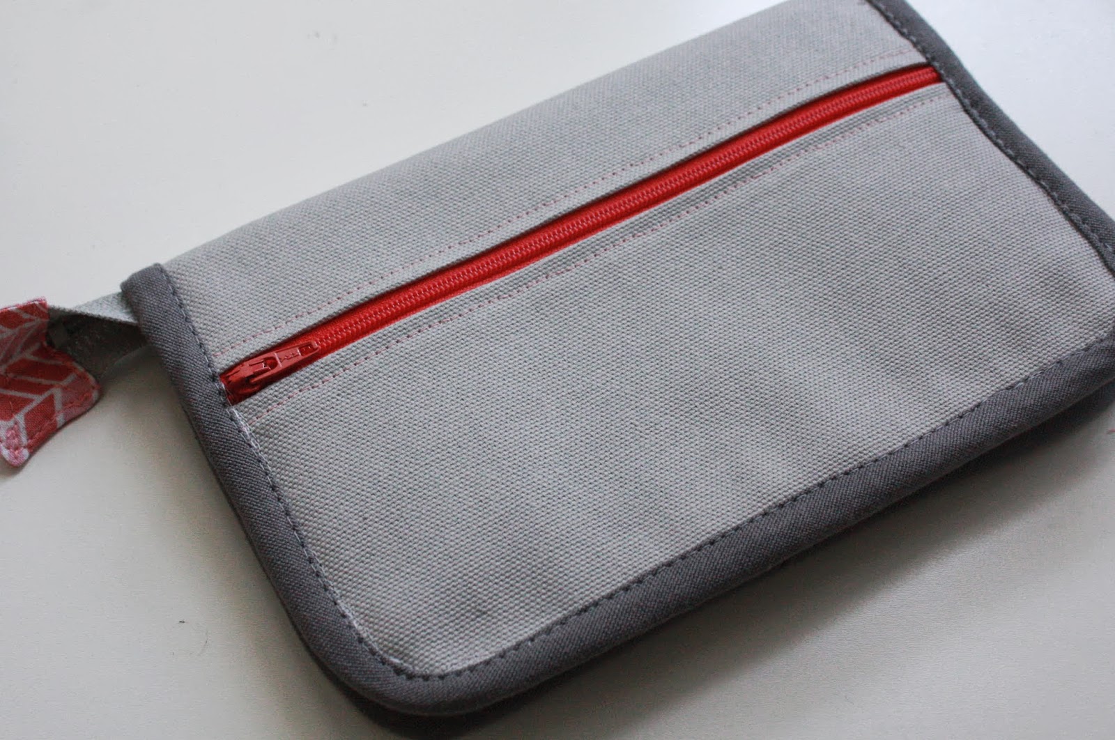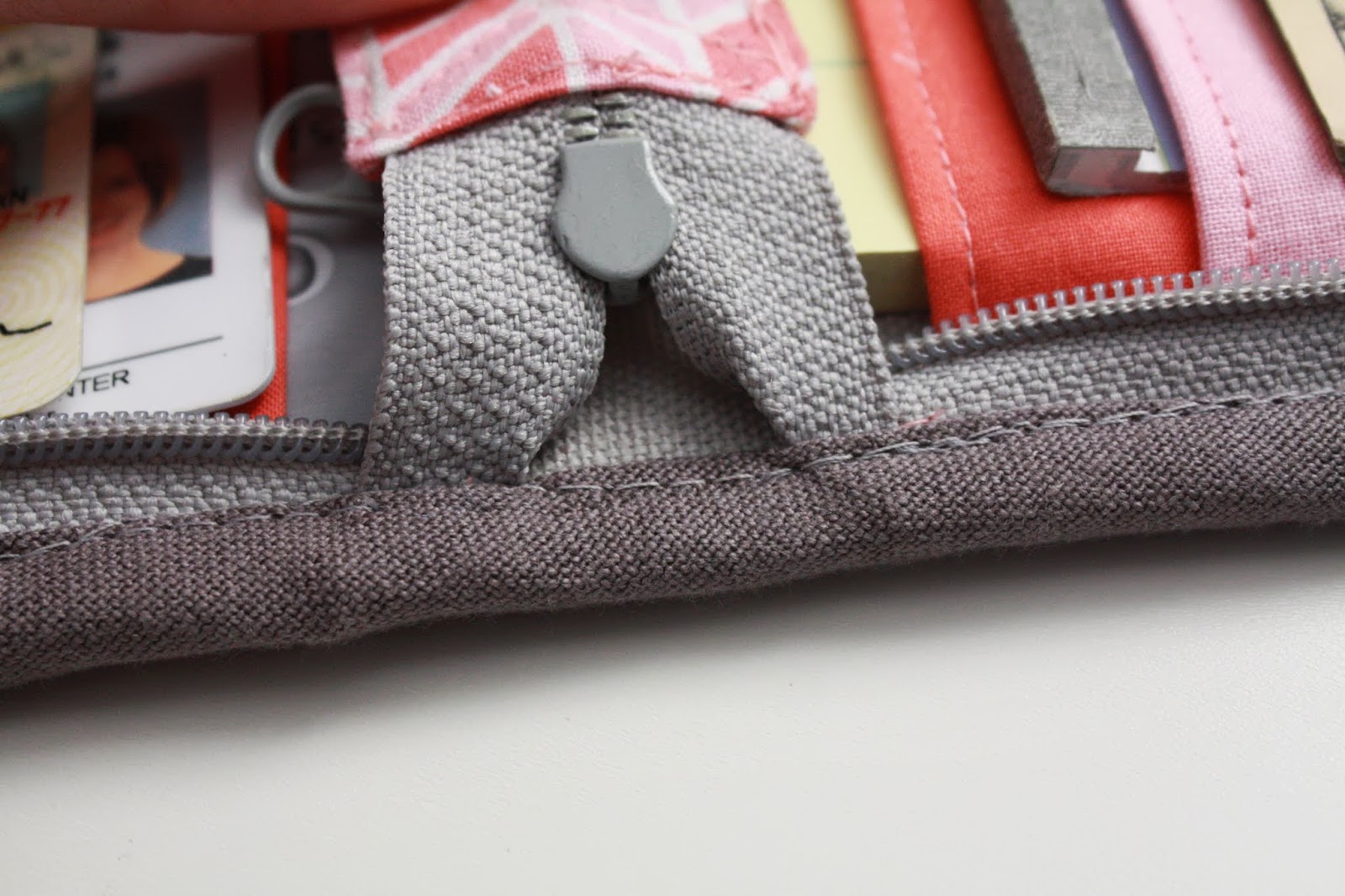 The directions were a little vague for the step of binding the edges at the point by the zipper (with the pull tab).  But after a while of fiddling, I realized that if you fold the zipper end toward the inside of the wallet, the binding can continue, uninterrupted around the edge (see photo, above):