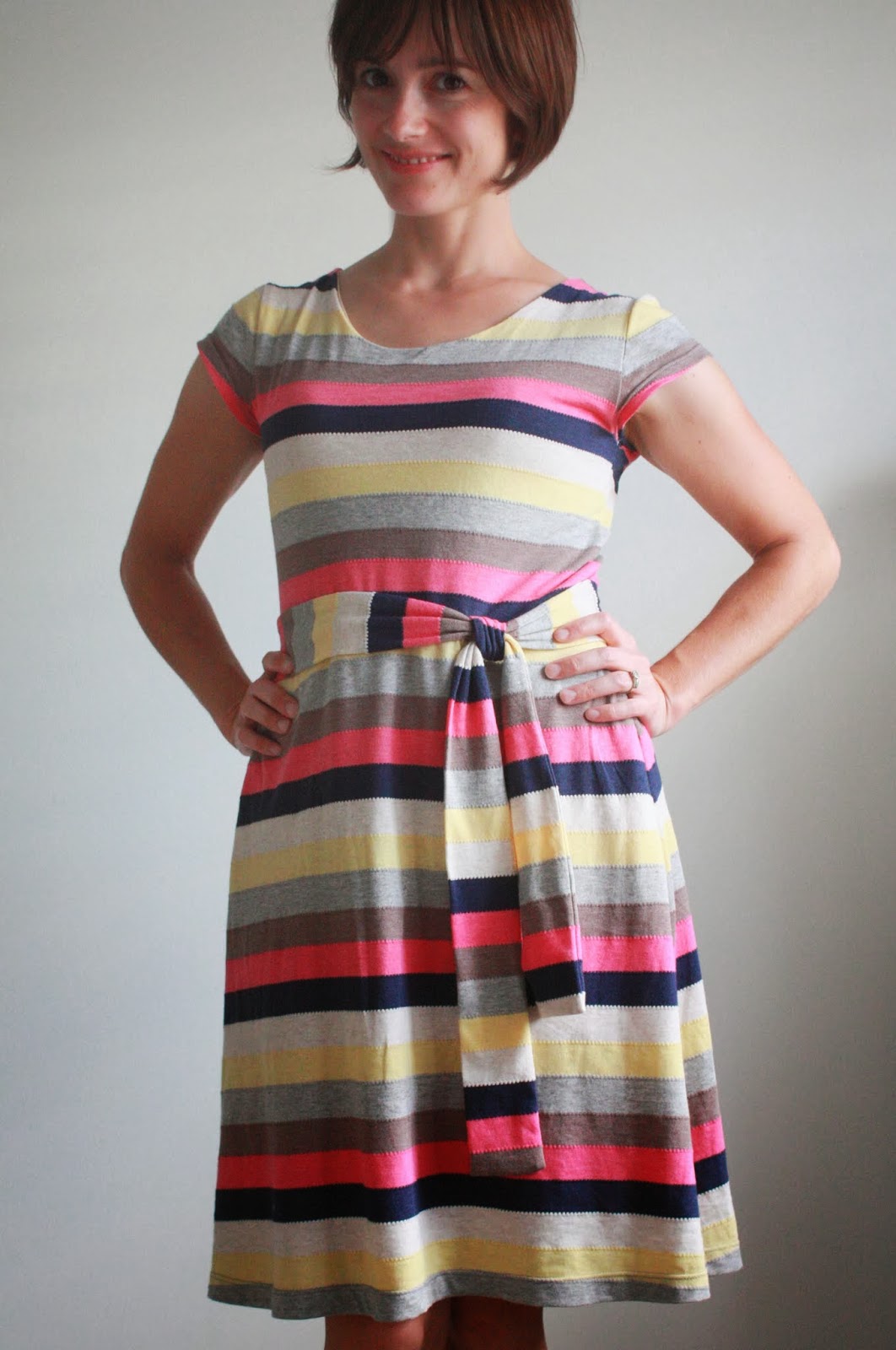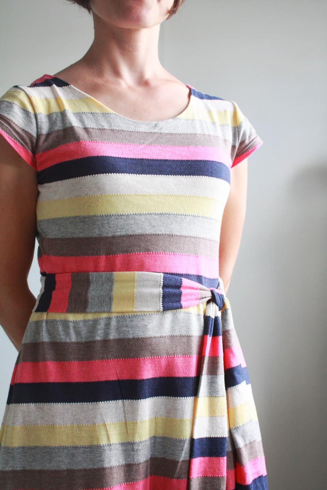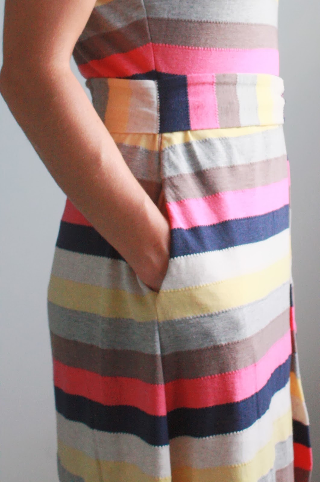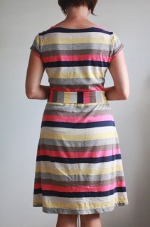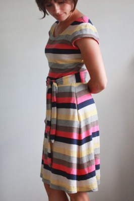 After seeing Rae’s recent maxi-dress, I was reminded that I had an unfinished item glaring at me in my sewing room, with fabric purchased from way back when she first posted about this great striped knit.