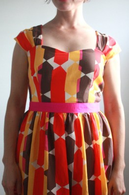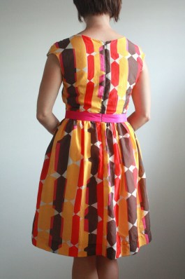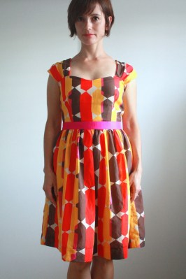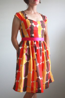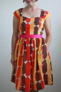 1. Fantastic fabric Nicole! It suits you beautifully. I know you wanted more pink in the dress, but I really think the pop of pink at the waistband is a flirty surprise, and it draws the eye to the smaller amounts of pink in the main body. So, the back is roughly half of the width of the original pattern? Looks perfectly balanced to me. And, making the lining in the A-line version is a brilliant idea. I love the look of a full skirt…but the reality is I don't have a tiny waist, and gathering in two layers of fabric can just create extra bulk where I don't want it. Thanks for the tips…my pattern is sitting here unopened and I may get to this dress yet.