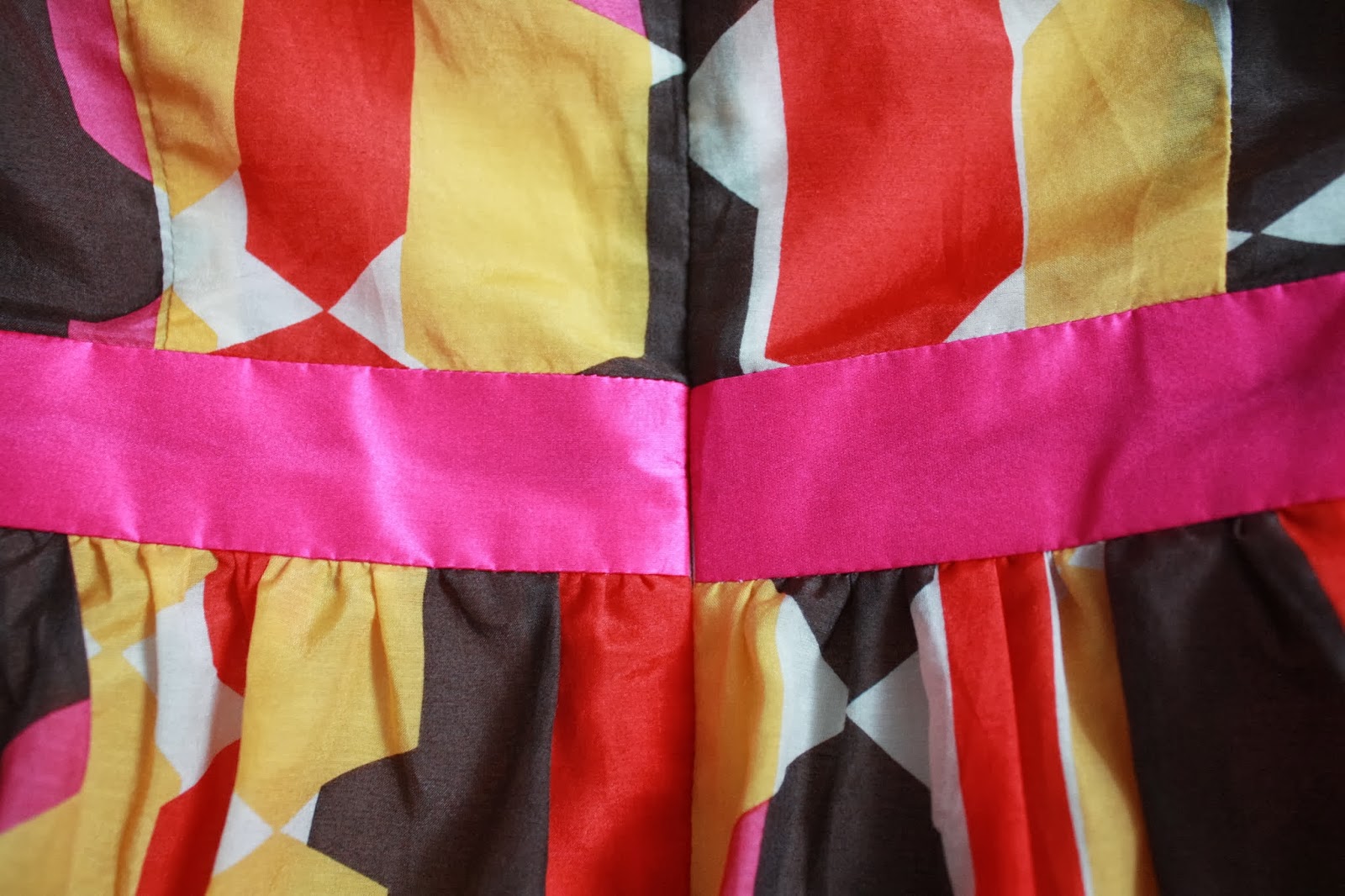 The hot pink silk taffeta waistband totally makes this dress, in my opinion.  I only wish the pink in the design was a little more apparent!
