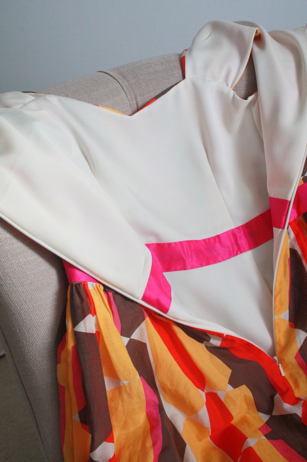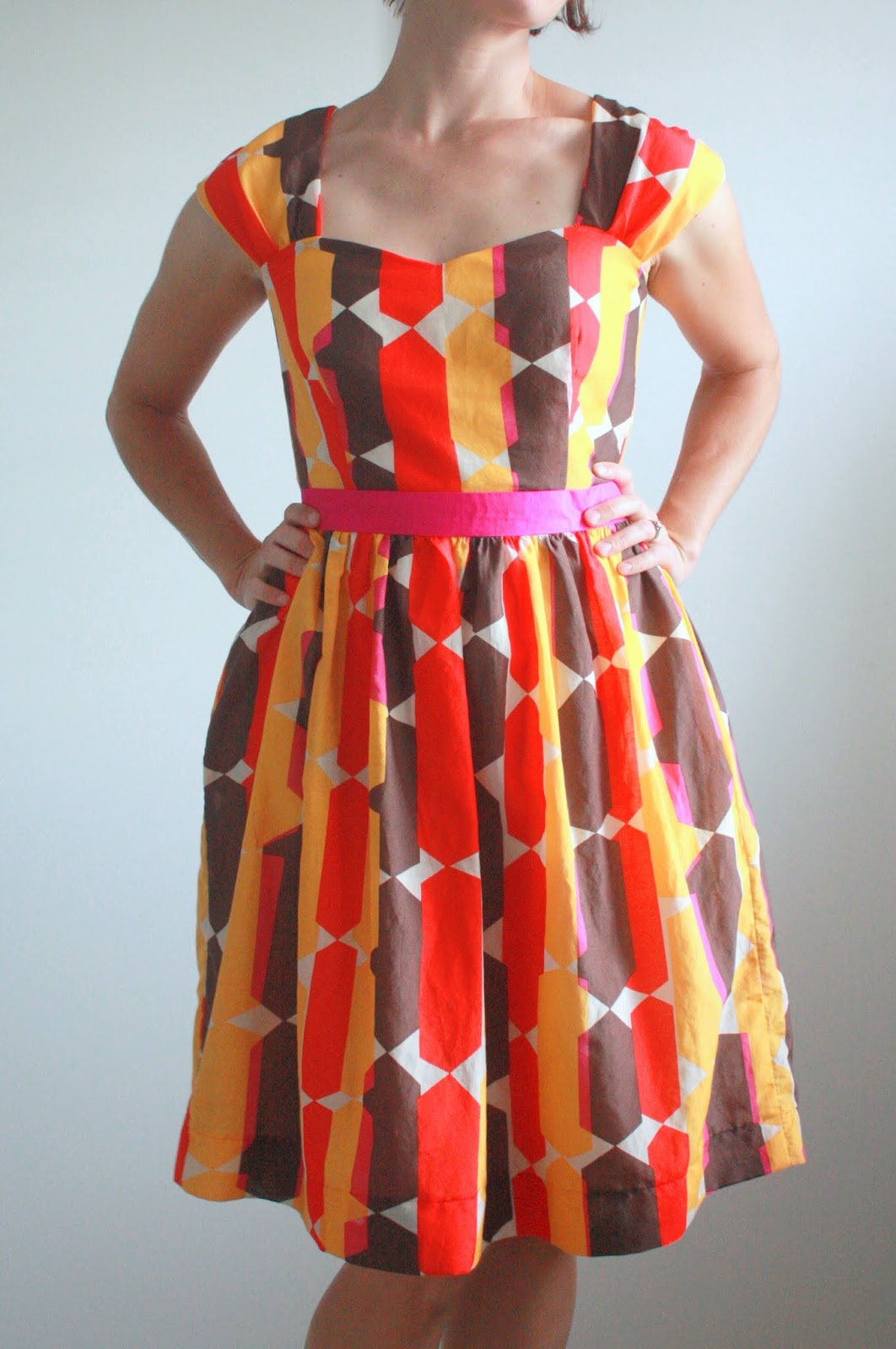 1. Fantastic fabric Nicole! It suits you beautifully. I know you wanted more pink in the dress, but I really think the pop of pink at the waistband is a flirty surprise, and it draws the eye to the smaller amounts of pink in the main body. So, the back is roughly half of the width of the original pattern? Looks perfectly balanced to me. And, making the lining in the A-line version is a brilliant idea. I love the look of a full skirt…but the reality is I don't have a tiny waist, and gathering in two layers of fabric can just create extra bulk where I don't want it. Thanks for the tips…my pattern is sitting here unopened and I may get to this dress yet.