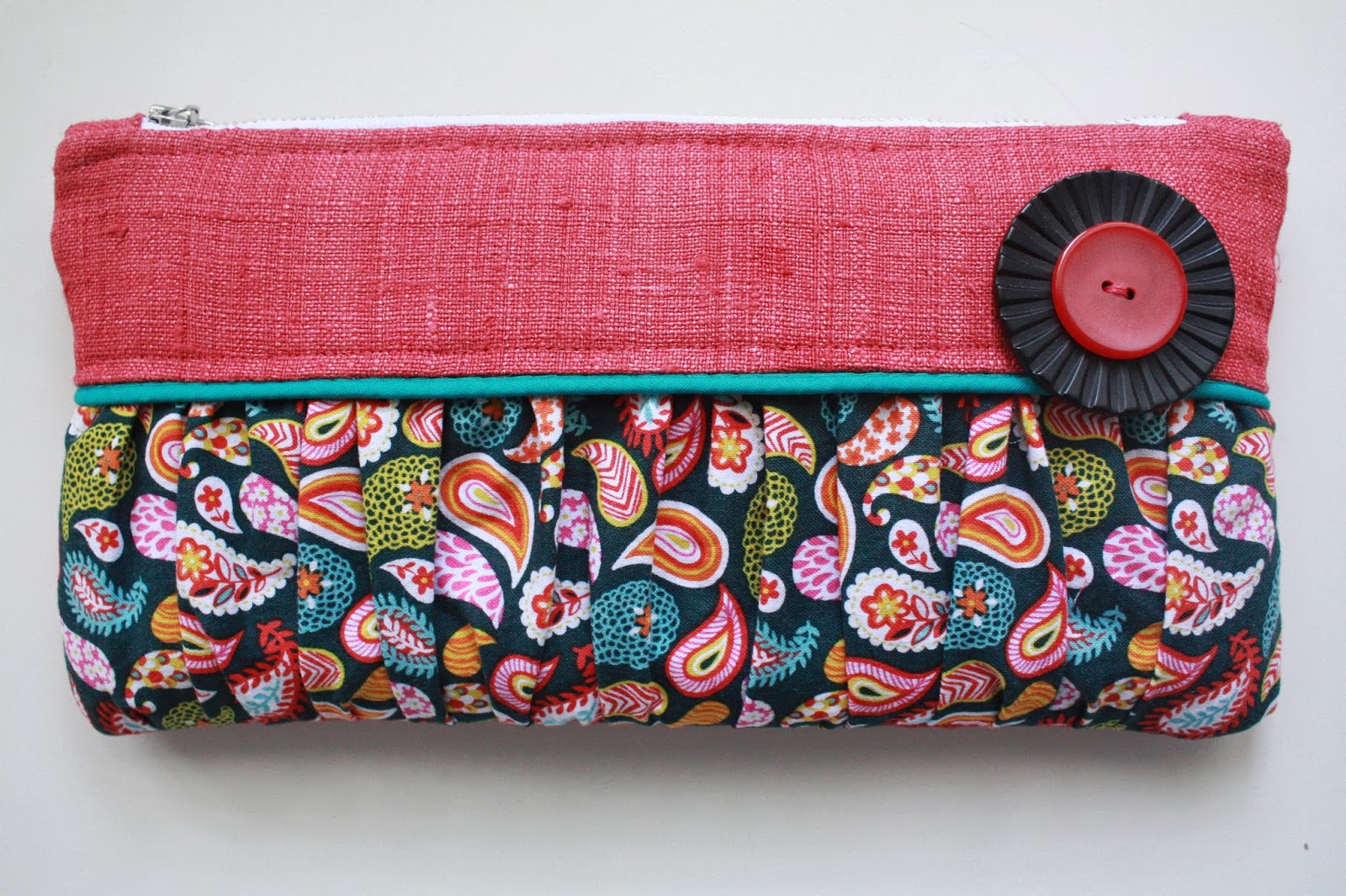 Since Dee has received the pouch I made for her, now I can show it off! In our initial emailing, Dee said she liked bright colors, like red and turquoise, and paisley, so I chose a bright paisley fabric from Hart’s and used some red silk upholstery fabric from FabMo.