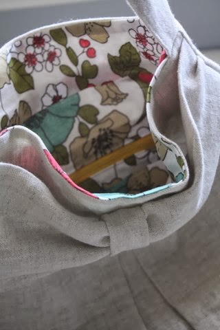 As an aside, I had pattern tested the “big” version of this bag, the original “Bow Pleat” (above), quite some time ago, but never posted about it. Samantha is running a special deal if you purchase both patterns, so check out her Etsy site for more details. Each bag is suitable for many different types of fabric, giving a different look and feel. With the slouchy linen fabric, this one reminds me of touring around an ocean-front boardwalk in the summer….