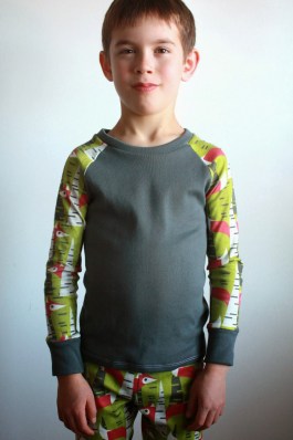 Sewing pajamas is fun–they’re fairly quick and super satisfying. For the pattern, I used the Recess Raglan (with much narrowed arms) for the top and the “Sleeping Johns” from Sew Liberated. Since I needed some knit ribbing for the cuffs and neckline, I ordered up some fabric from Hart’s (and got it the very next day!). I knew it was sold as a “tube” of fabric, but when it arrived, I realized it was the perfect dimensions for my skinny boy. So, I cut the top as a single piece (no side seams!), then stitched the underarm seams on the sleeves. Since the fabric is nice and stretchy, setting in the raglan sleeves was a cinch. Serging the ribbing on such skinny cuffs was a whole different story, though!