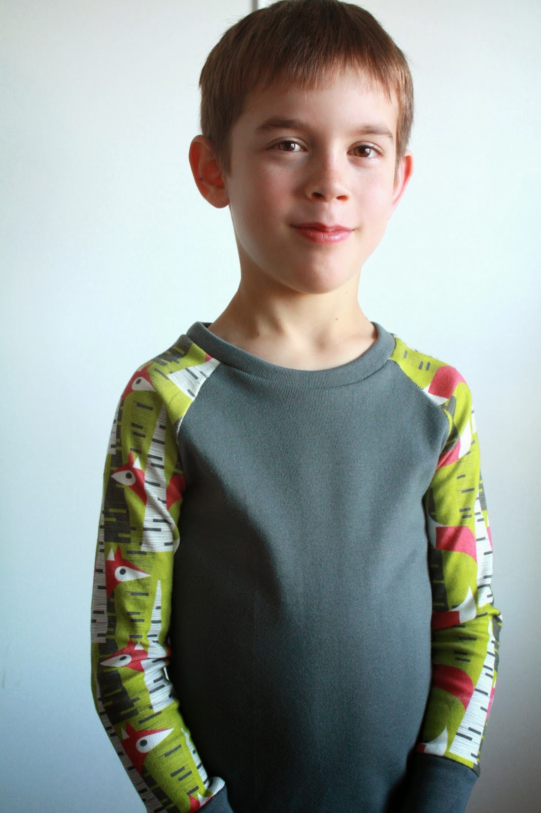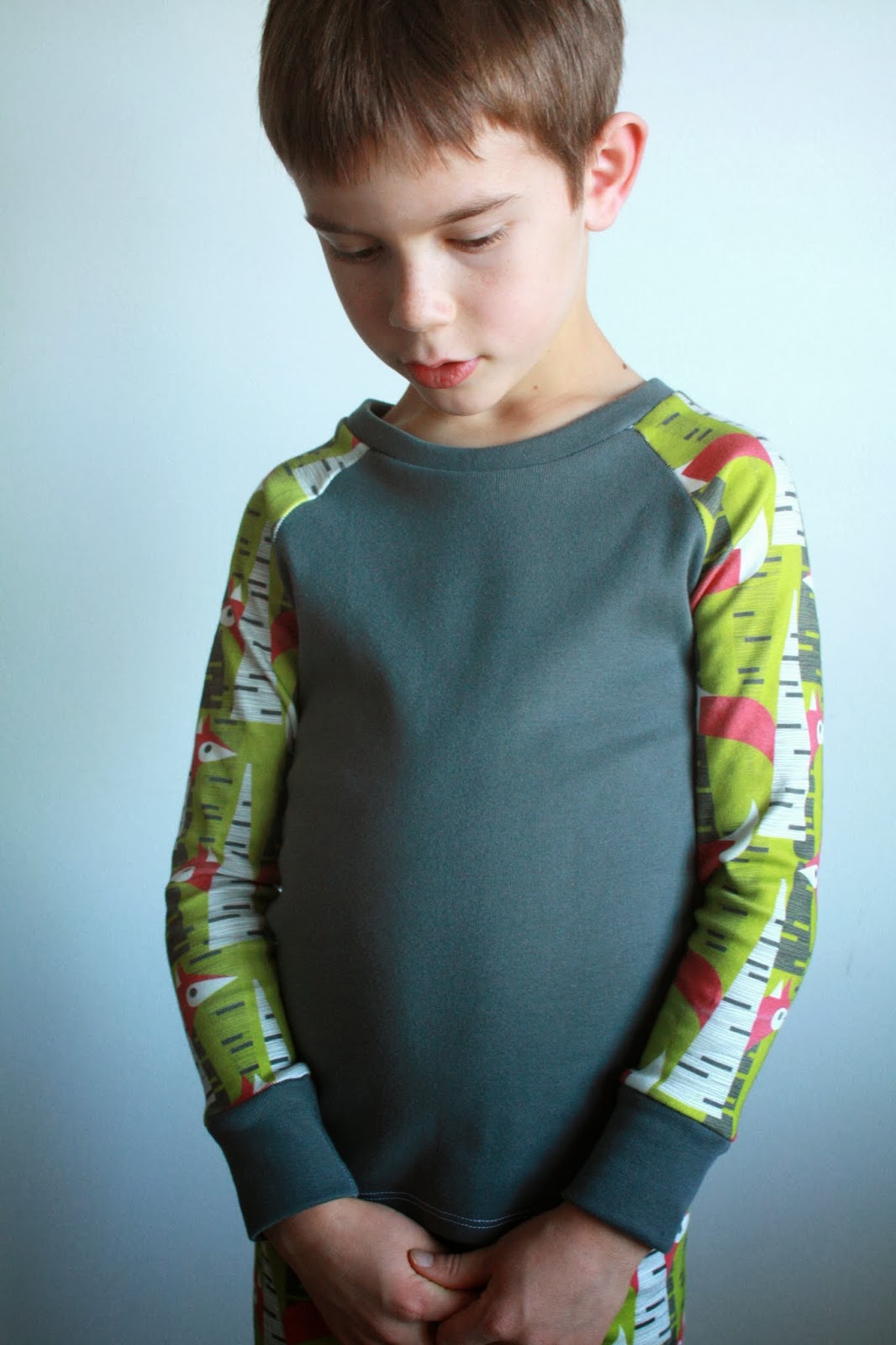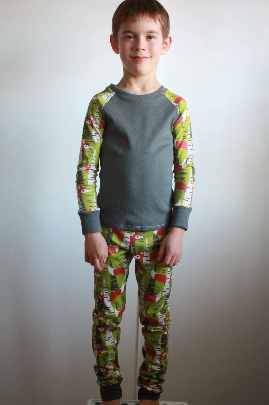 Okay, so I bought the gray knit ribbing from Hart’s, but the real story is the printed “Mod Fox” fabric. My son LOVES foxes. His love of all animals is pretty huge, but foxes are at the top of the list. So, Spoonflower to the rescue! The hiding foxes, the red/green colorway…it was too perfect, and seriously worth the price of a yard of the organic knit. And of course, he loves it. He insisted on wearing the PJs all day, and really, I couldn’t bear to stop him 🙂