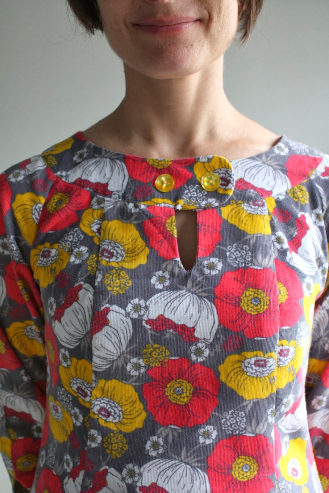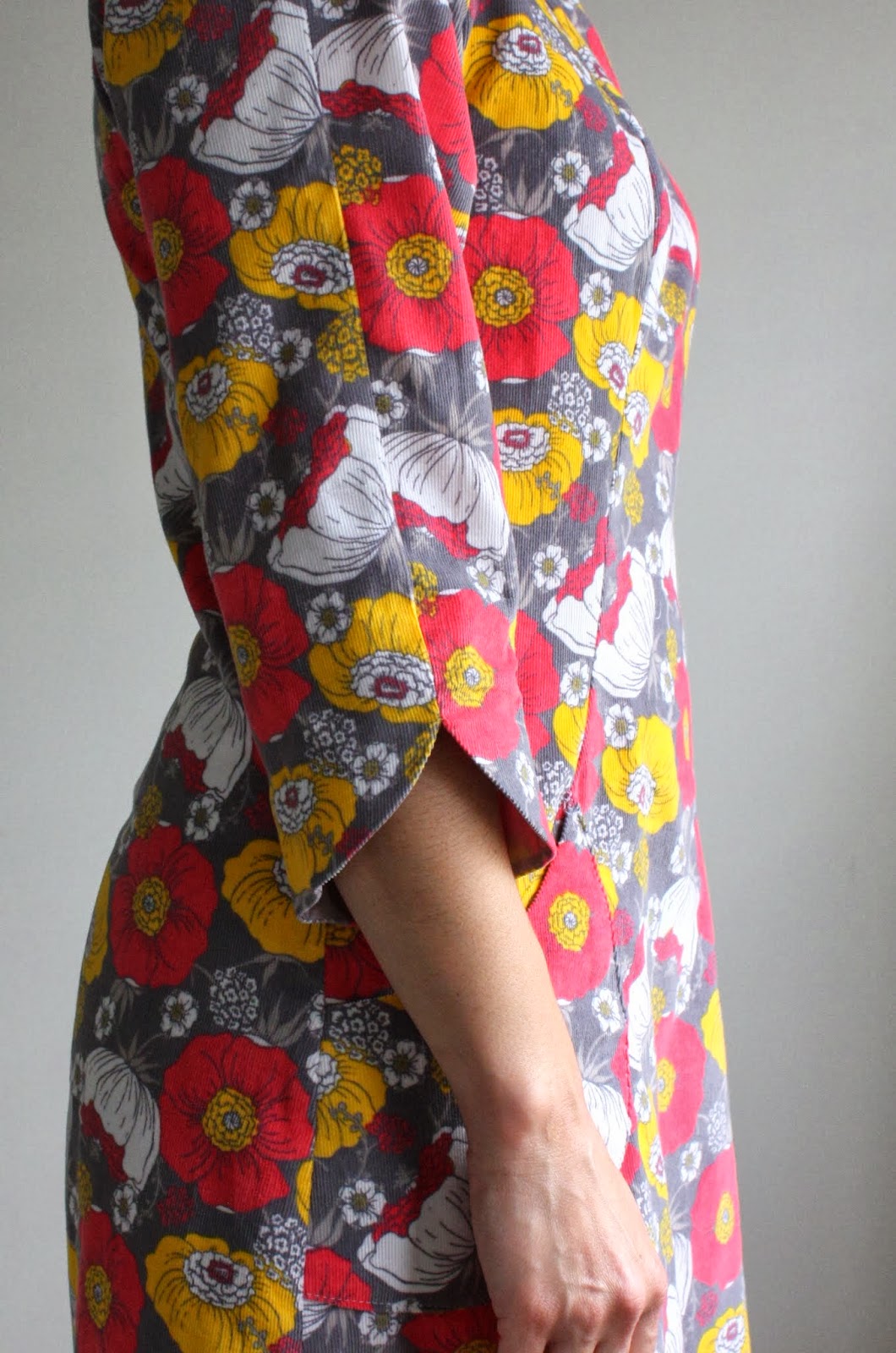 The fabric is a springy, but is respectful of a chilly morning in baby wale corduroy (purchased at Fabric.com here). The flowers remind me of California poppies. Considering it’s corduroy, it’s surprisingly lightweight!