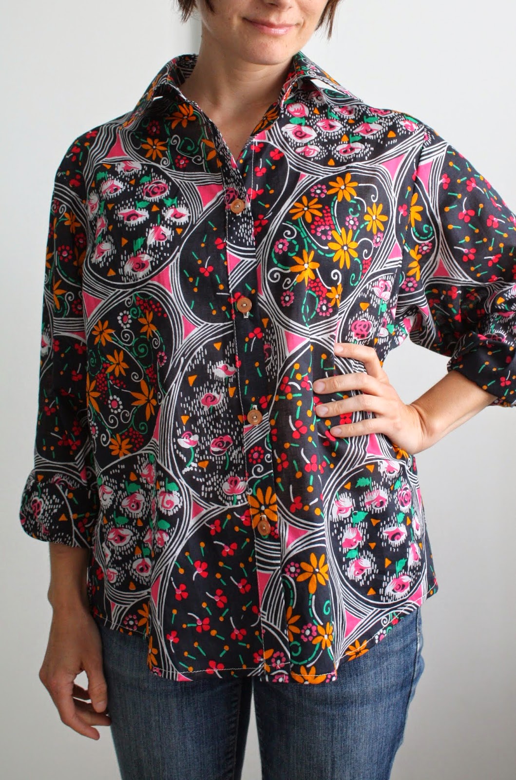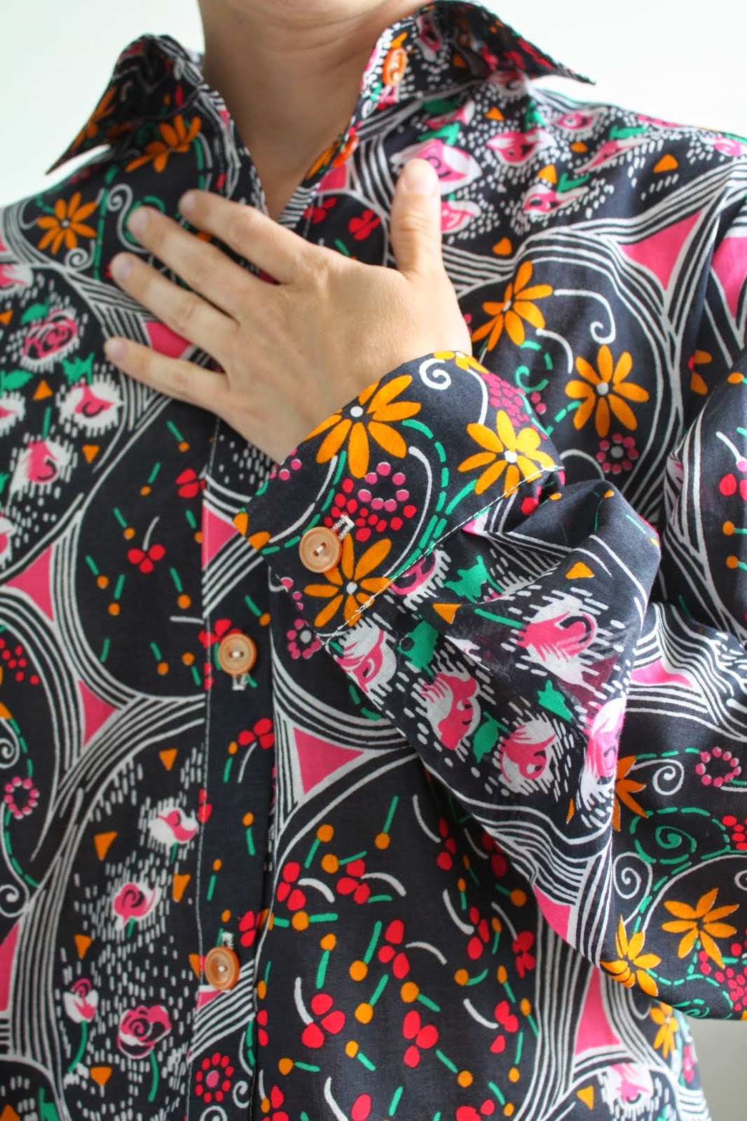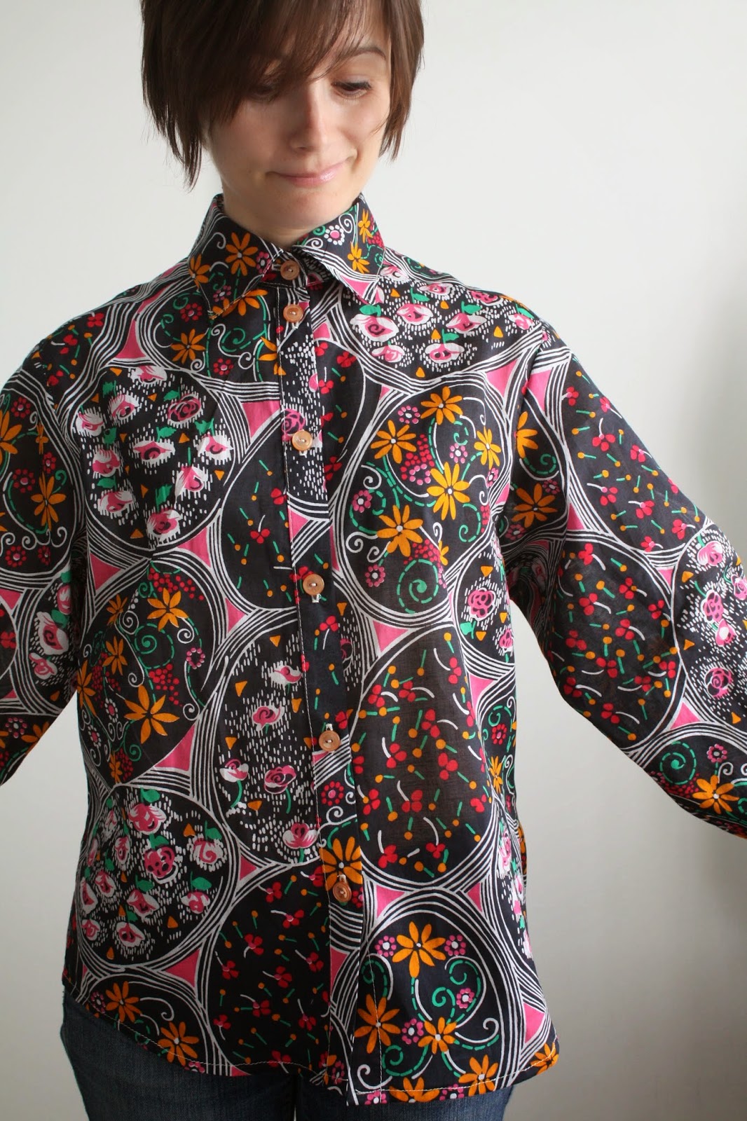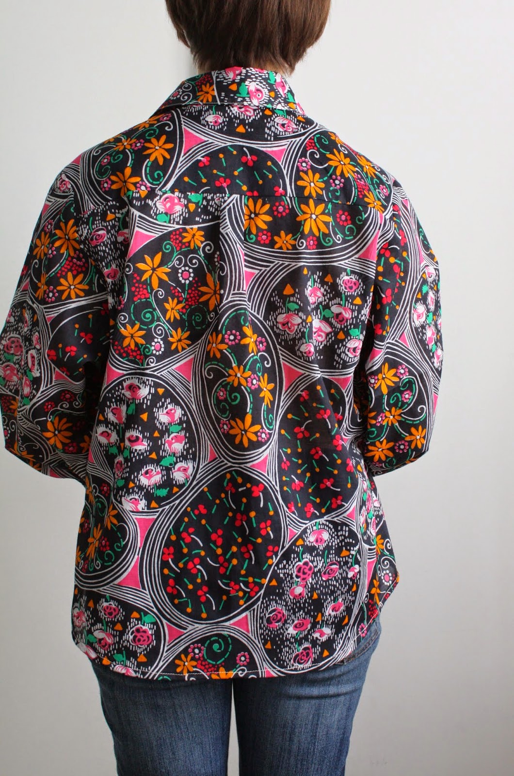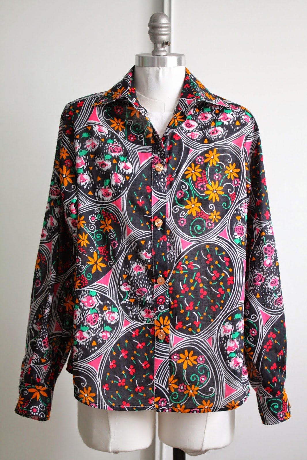 With only about a month left of my semester-long patternmaking class, our first “real” garment (the first made in fashion fabric) is due this Thursday: the casual shirt. Using our slopers, we were to draft a slightly oversized shirt with collar, collar stand, button placket, and cuffs with buttons and continuous placket. My sloper set isn’t my size to begin with, so making an oversized top is clearly not something I can wear myself. And as such, I wanted to spend as little as possible on fabric 🙂 I found this apparently vintage fabric (from France!) in the clearance rack at the local shop for $3.99/ yard. If it were made into a cute fitted top, I think I would totally rock this crazy print, but as an oversized…well, not so much. 😦
