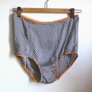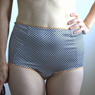 It has taken me ages to get up the nerve to write this post. The undies I’m about to talk about and show pictures of are big. BIG. That’s the point, really, since I was looking for “bloomers” that could keep me fully covered, and without panty lines, under a knit dress. I found the Betty High Waisted Panties pattern by Ohhh Lulu, and knew I had the right idea. Above my belly button? Yup, hits at my natural waist and I’m owning it. The pattern is easy and fast. I made some test undies (highly unattractive, yet awesomely comfortable in stretch nylon bathing suit lining material), but this is my first “real” pair and they are marvelous: