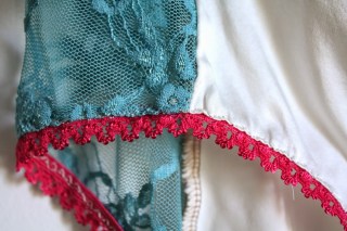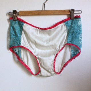 This is probably my favorite pair, though the silk is pilling a bit after only a few washes. Stretch silk from Hart’s, stretch teal lace (I think this is the right fabric–I bought it in person at Hart’s) and hot pink trim from Britex. The lace is very high quality and looks like it will be nice-looking for a while.