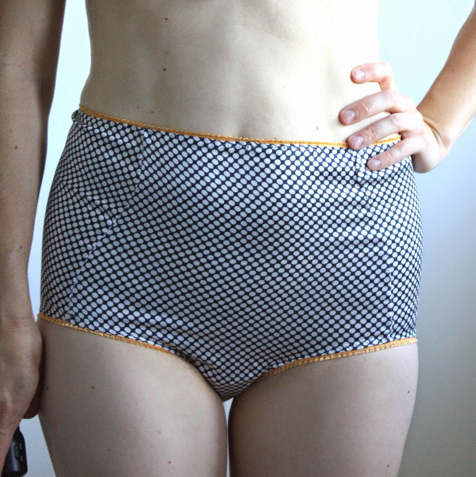 Okay, so since I forced my husband to model his boxer-briefs, I feel morally obligated to show a photo of myself wearing my handmade undies, too. Luckily, these are opaque and significantly more enormous than any bikini bottom you’ll see at the beach: