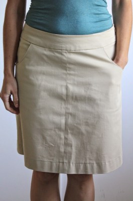 tretch cotton khaki fabric since I really needed this particular basic. To be truthful, it is not very exciting–just a basic, low waist skirt with a contoured waistband, four panels, pockets and a side zip. What it lacks in interest, it makes up in practicality! Ha!